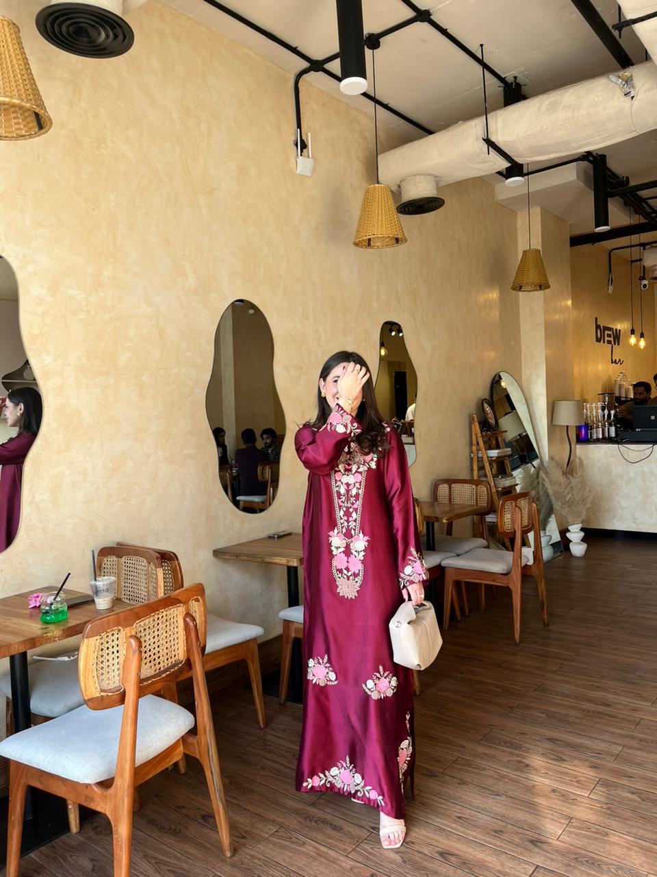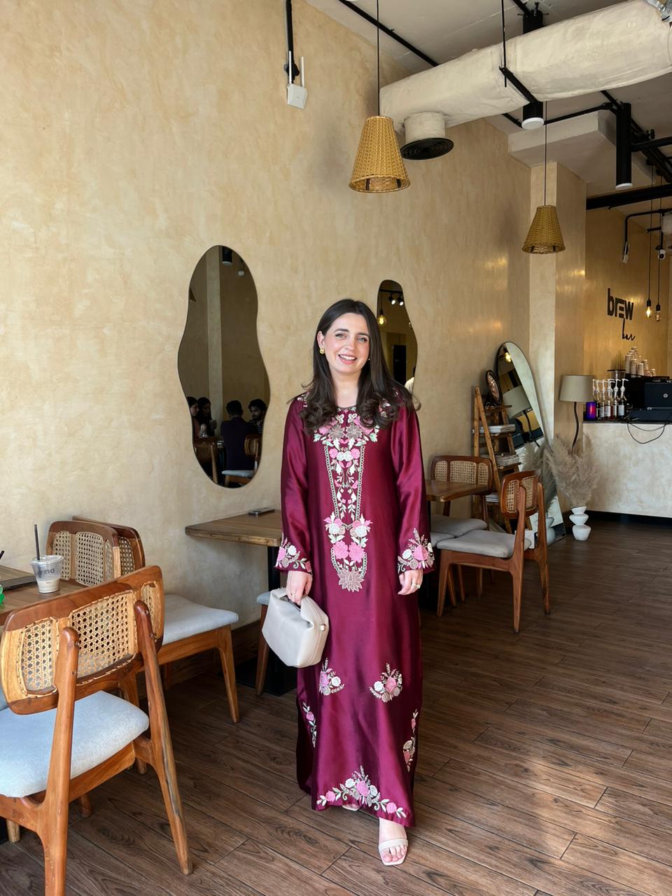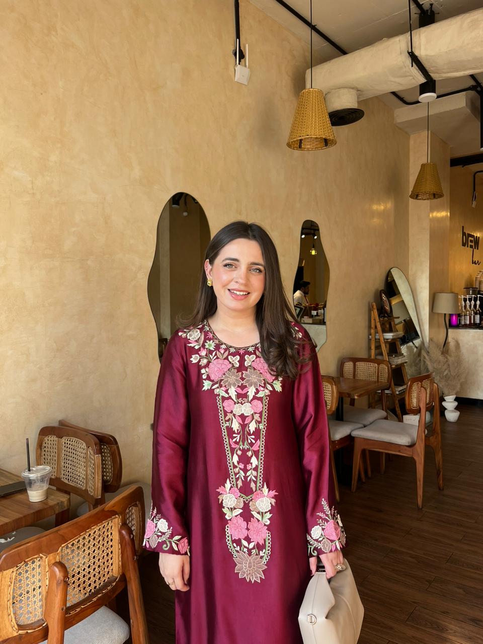 This ensemble is a deep maroon floor-length silk dress adorned with intricate floral embroidery in shades of light pink, beige, and gold. The embroidery is concentrated around the neckline, sleeves, and along the front of the dress, adding a graceful, traditional charm.The fabric has a subtle sheen, giving it a rich and luxurious appearance.This outfit is perfect for a daytime outing or semi-formal gathering