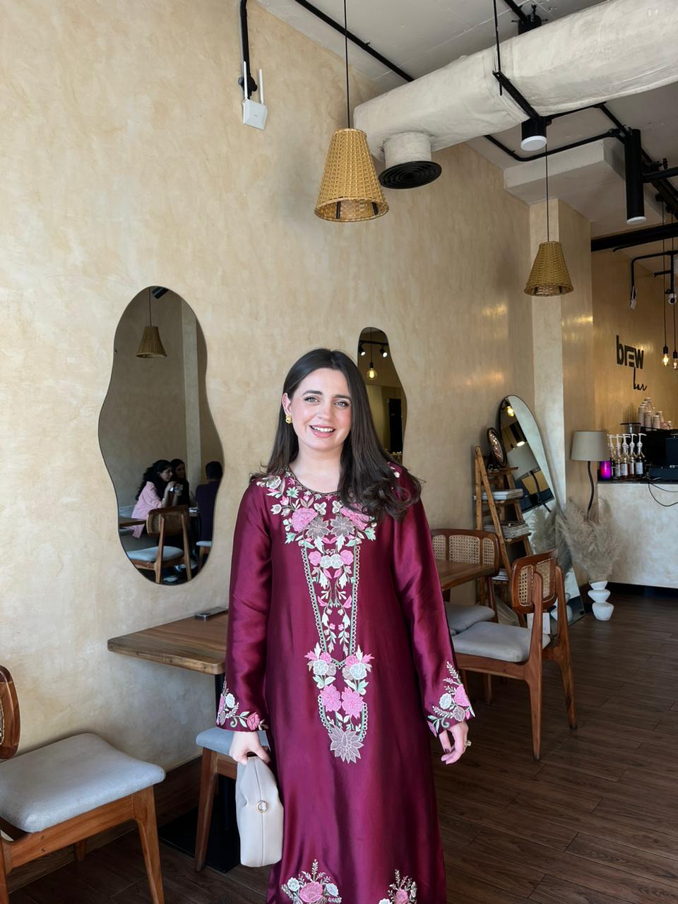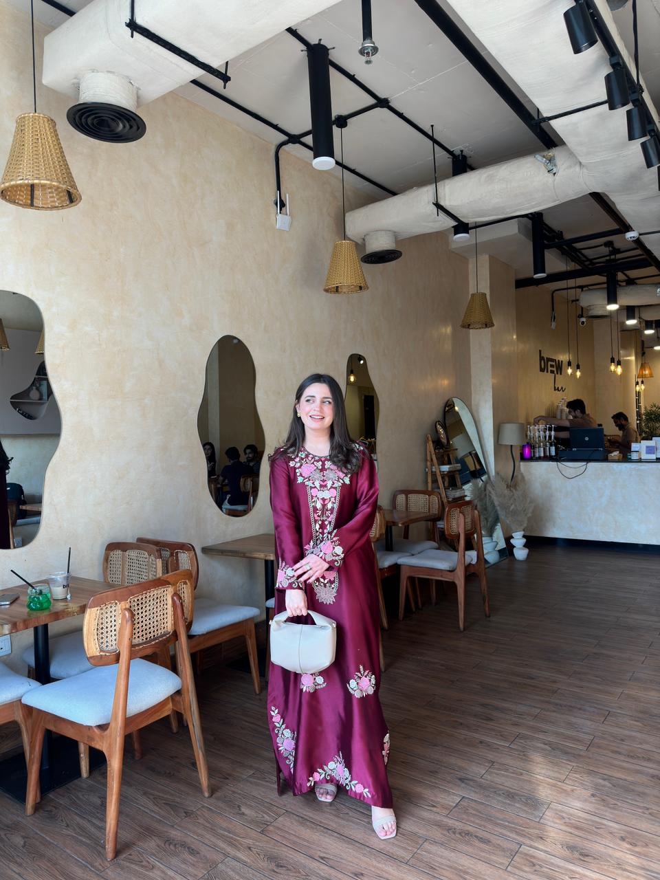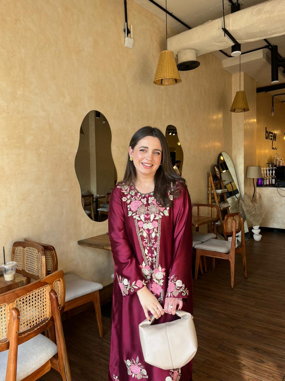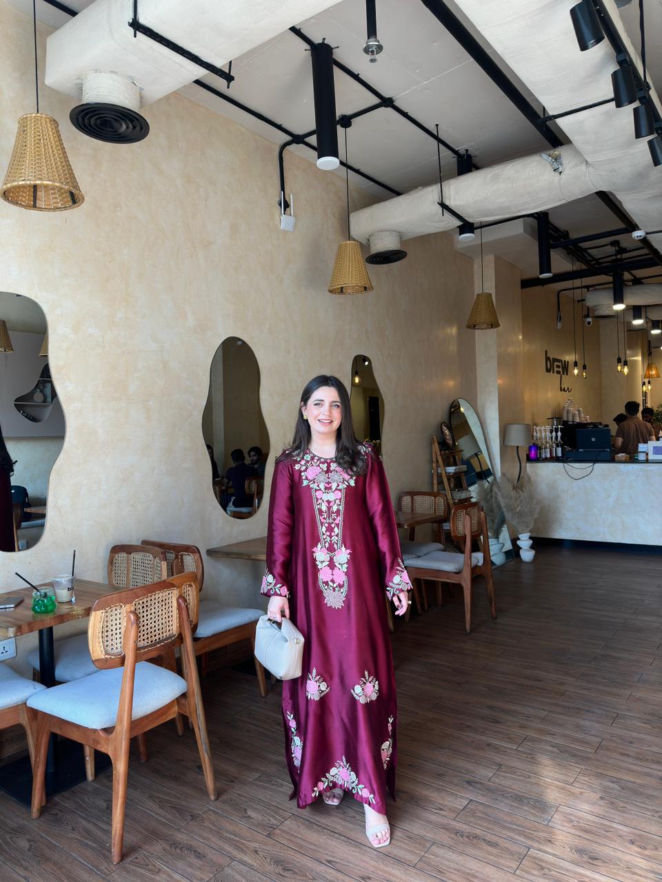 This ensemble is a deep maroon floor-length silk dress adorned with intricate floral embroidery in shades of light pink, beige, and gold. The embroidery is concentrated around the neckline, sleeves, and along the front of the dress, adding a graceful, traditional charm.The fabric has a subtle sheen, giving it a rich and luxurious appearance.This outfit is perfect for a daytime outing or semi-formal gathering