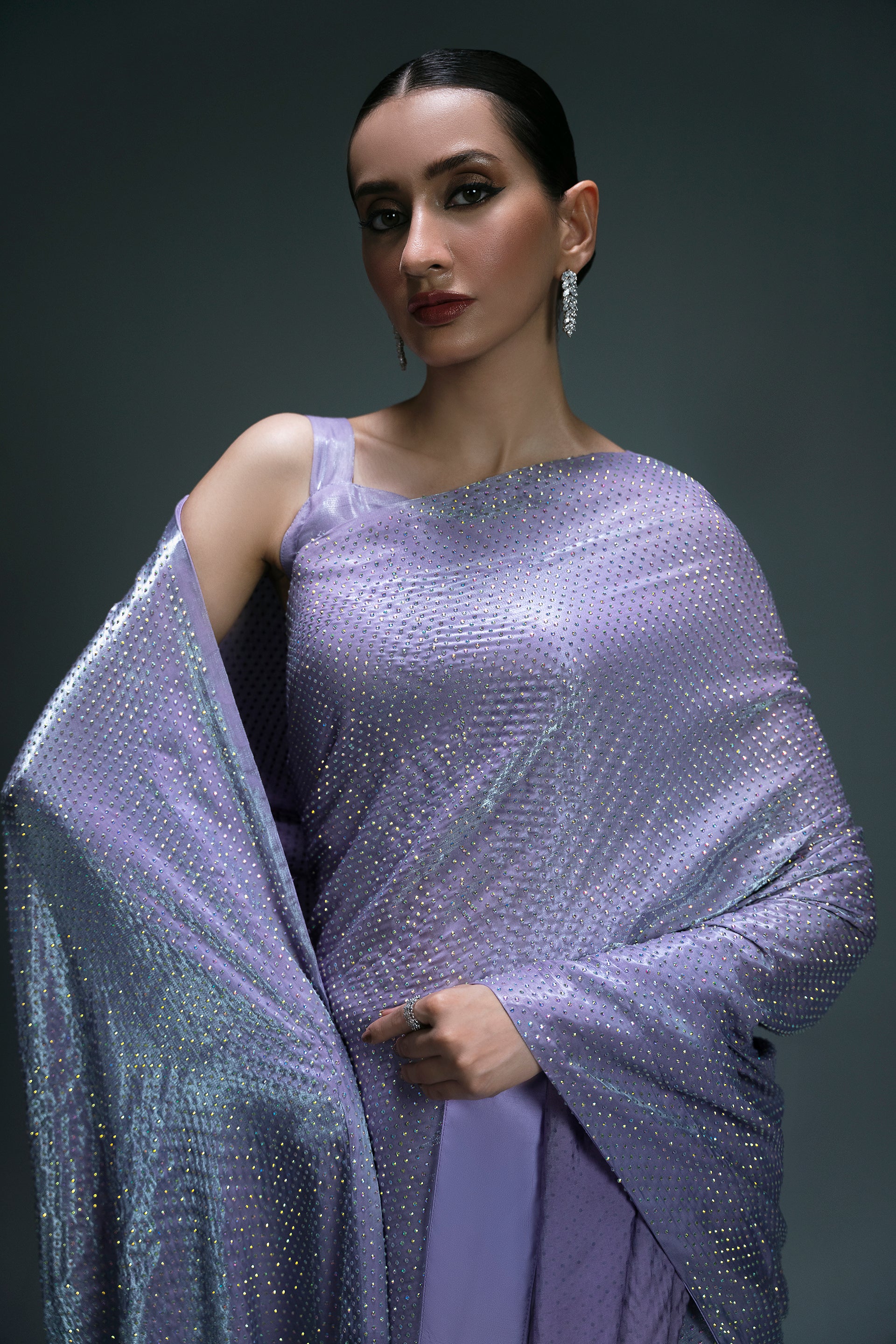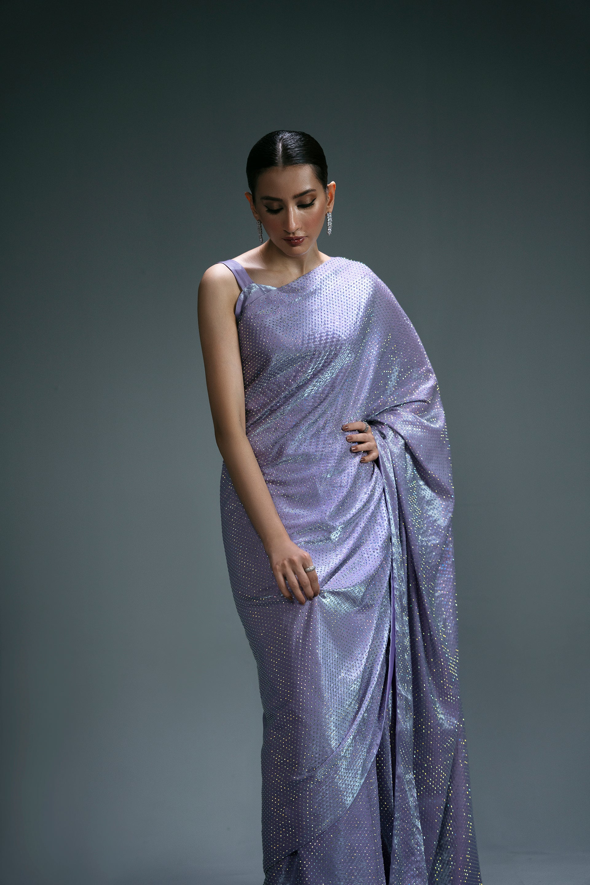 A captivating pure Arabic shimmer saree in lilac, elegantly adorned with a spray of silver rhinestones. Paired with a bold-cut sweetheart neckline blouse crafted from the same shimmer fabric, this saree offers a sophisticated and modern look.