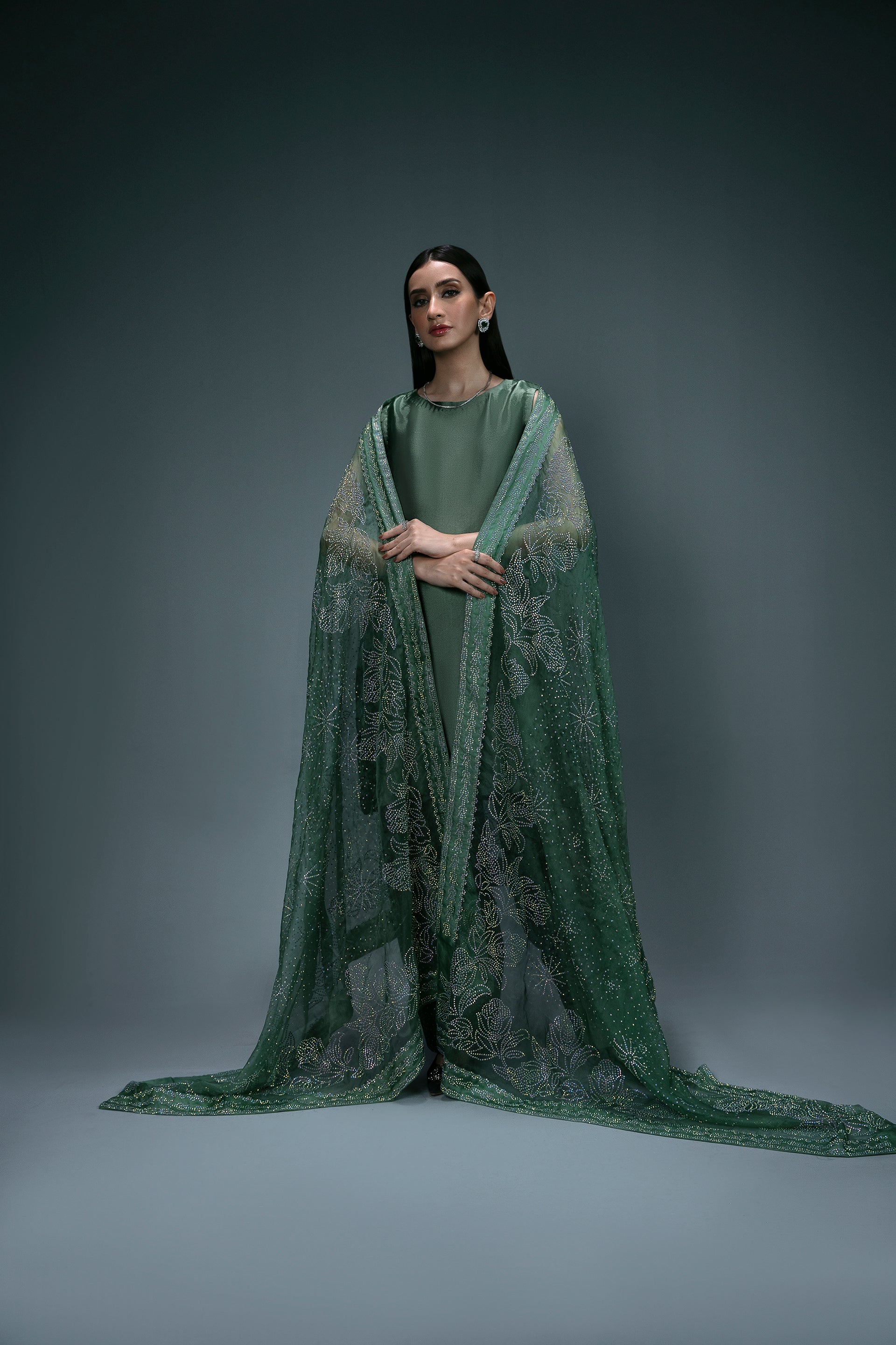 An elegant three-piece suit in dark green, featuring a plain short shirt made from pure tassel silk. It is paired with a traditional shalwar, highlighted with a subtle rhinestone spray that complements the base color. The look is completed with a pure organza dupatta, beautifully adorned with silver rhinestones in a floral pattern, adding a touch of sophistication.