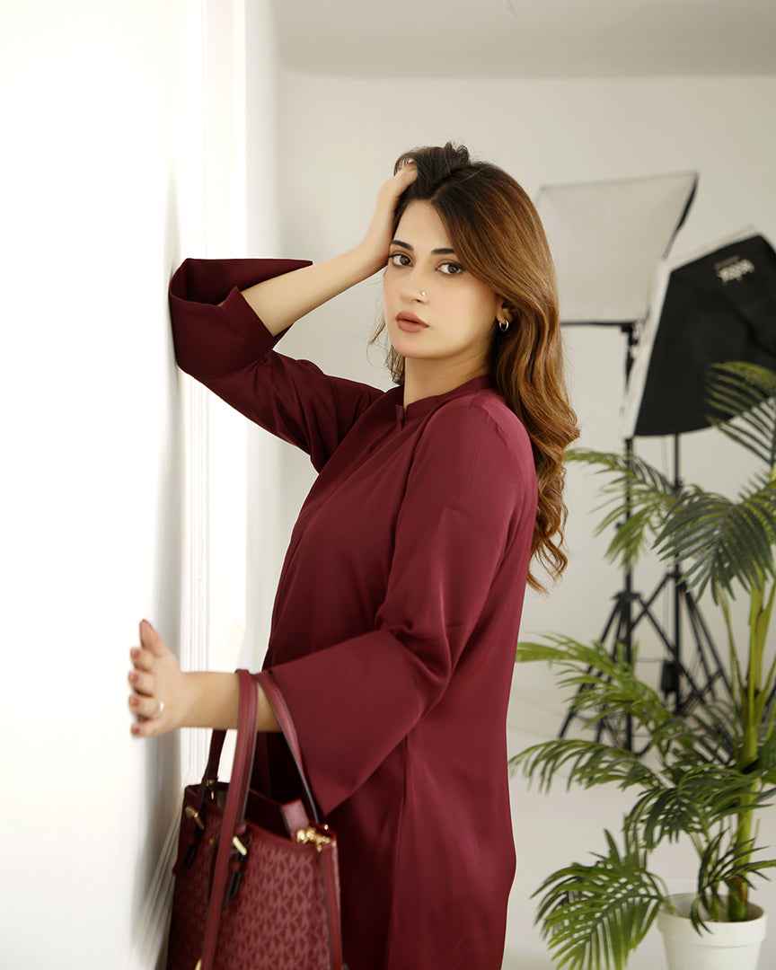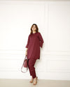 A dark maroon short shirt made from pure georgette, featuring a band collar and buttoned placket, with stylish slits at the bottom of the sleeves. It is paired with a light traditional-style shalwar, designed in a pant style with loops and buttons at the bottom for a subtle yet chic touch. This ensemble blends traditional elegance with modern comfort, perfect for a sophisticated yet relaxed look.