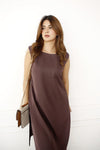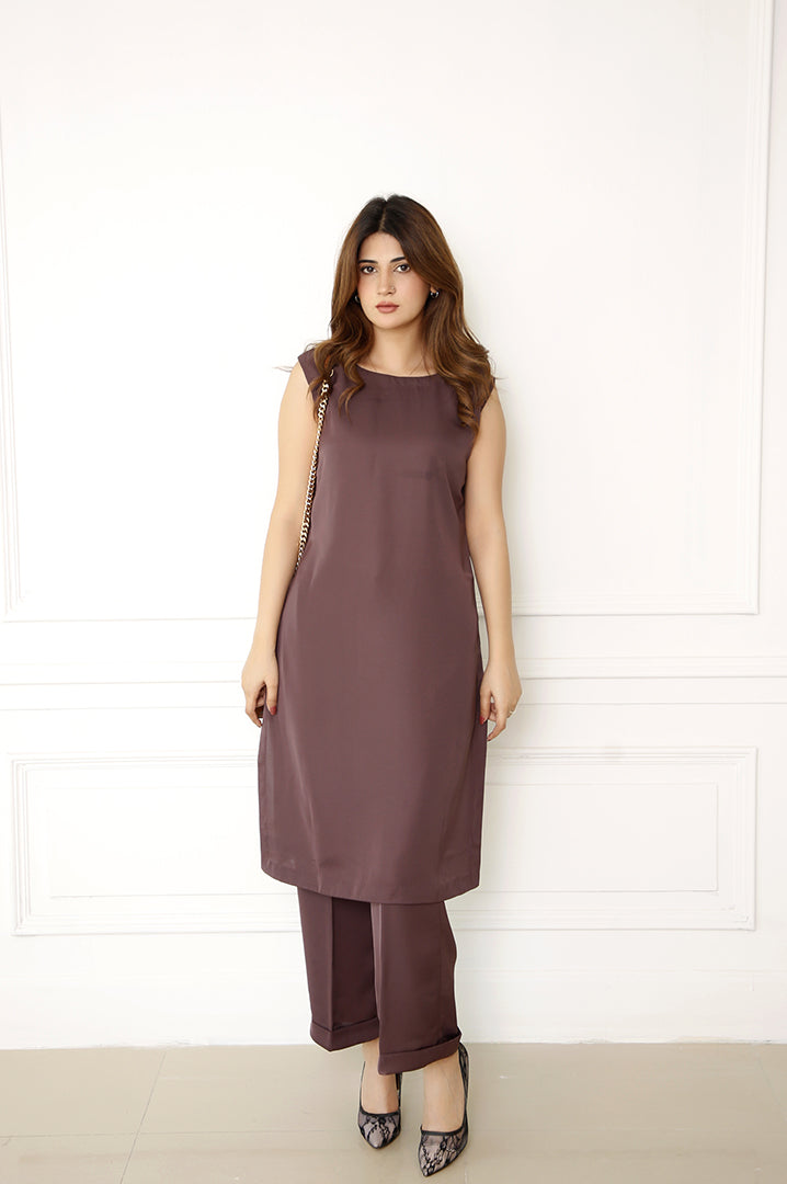 A pure georgette sleeveless short shirt in dark brown, featuring a boat neckline for a sleek, modern look. It is paired with light palazzo pants that showcase a folded patch design, offering both elegance and comfort. The rich color and flowing fabric make this outfit perfect for a chic and relaxed style.