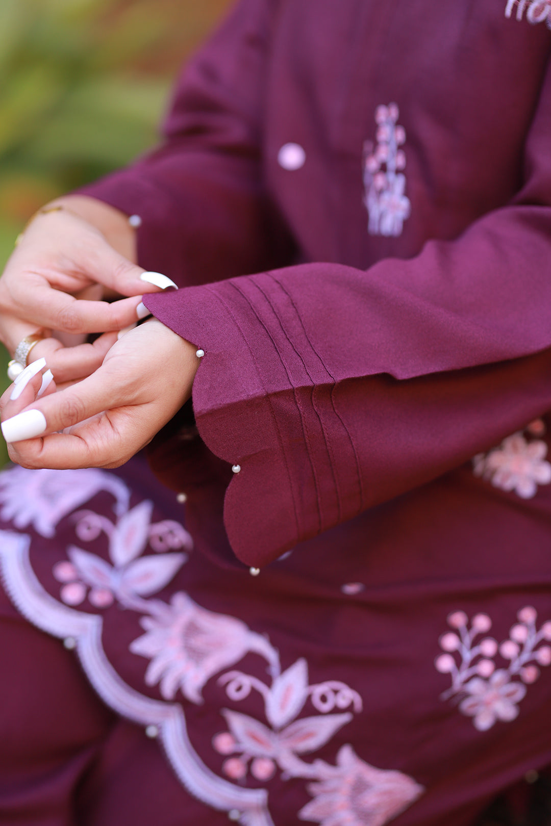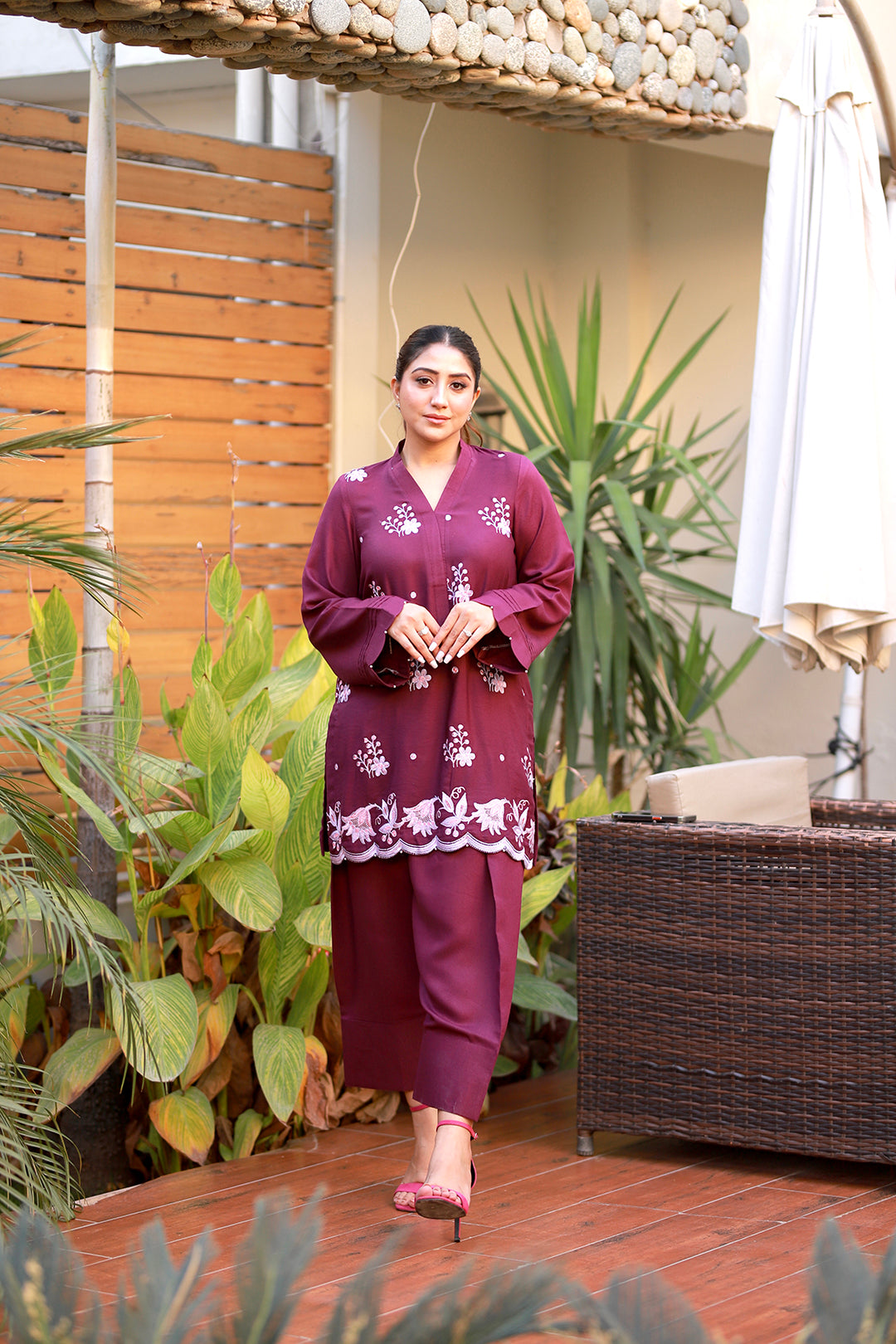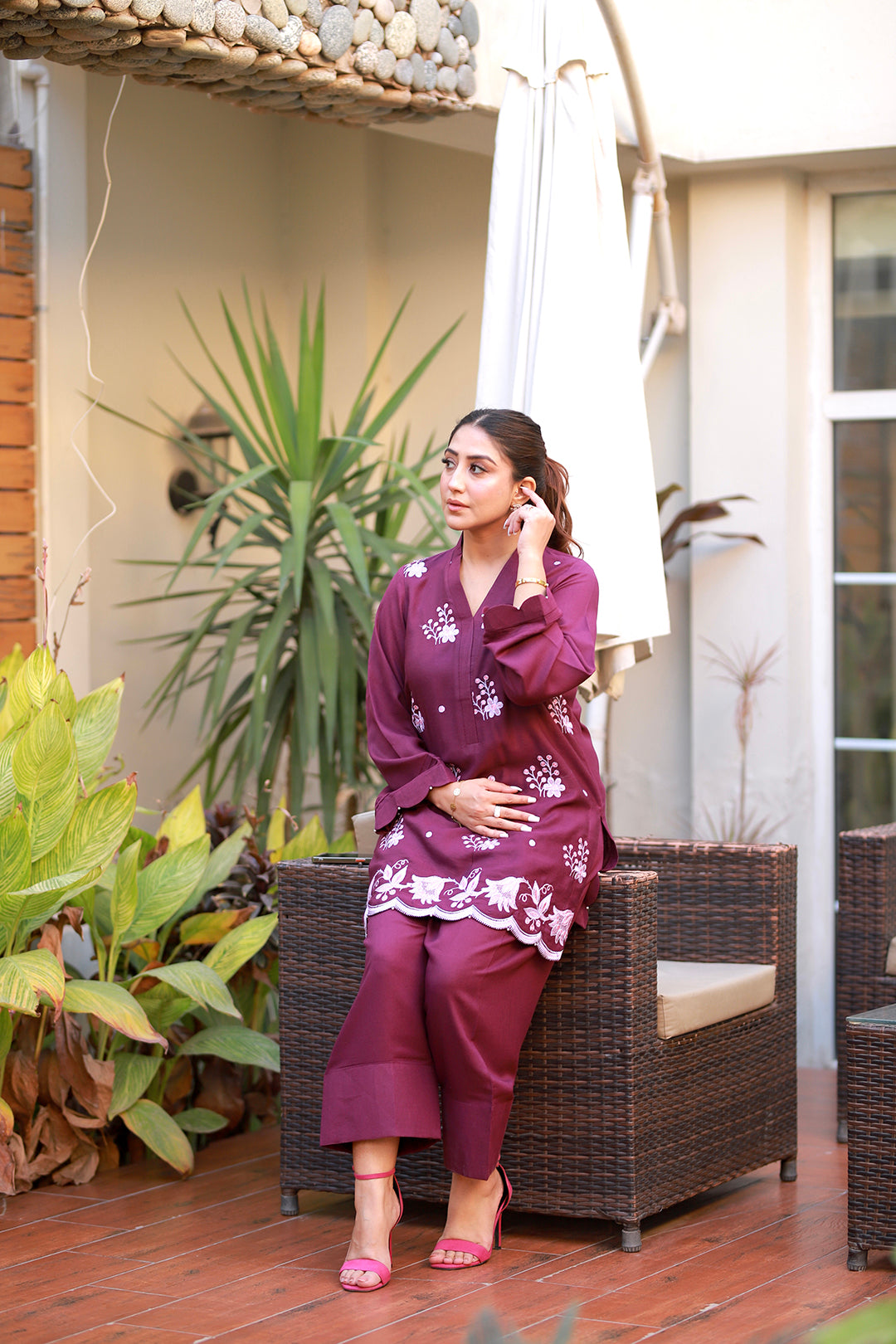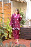 A plum purple karandi ensemble featuring a shirt paired with a traditional belted shalwar, exuding elegance and grace. The shirt is adorned with intricate multi-head machine embroidery, while the hem features detailed cutwork enhanced with delicate pearls. The sleeves are beautifully styled with scalloped edges and pleats, adding a refined touch. This sophisticated outfit is ideal for winter festivities or special gatherings, blending traditional craftsmanship with modern elegance.