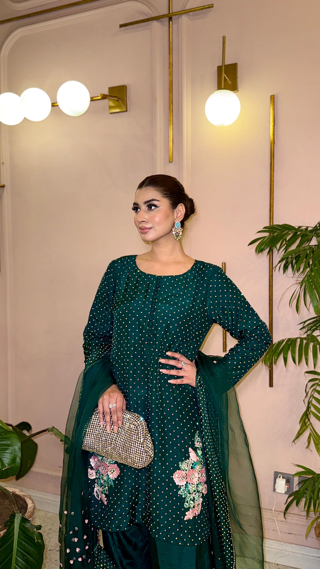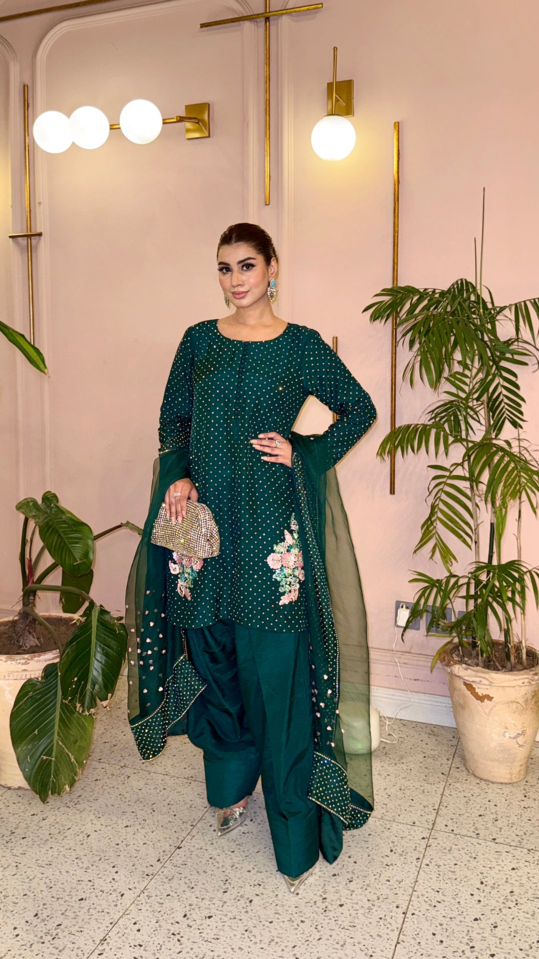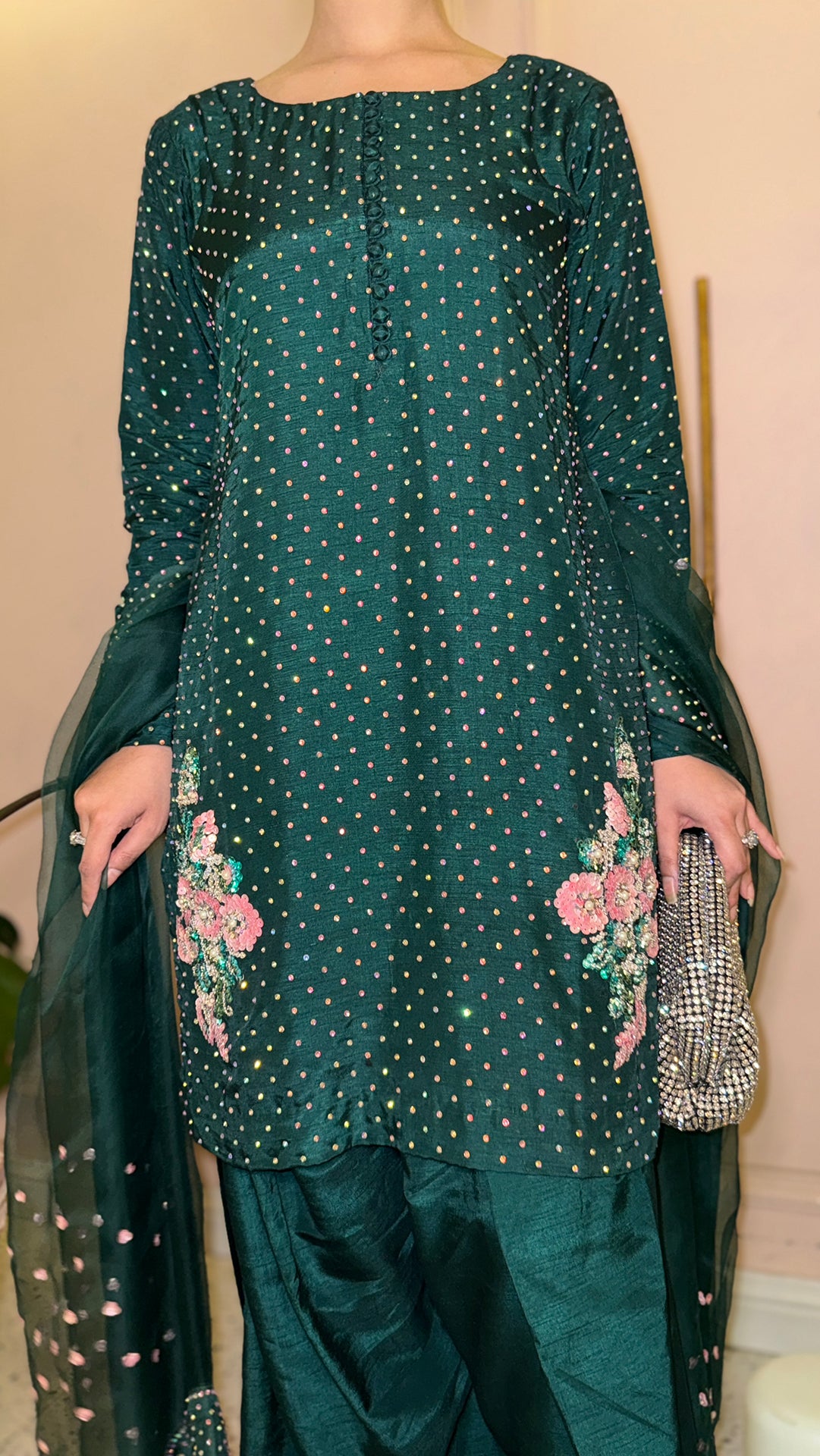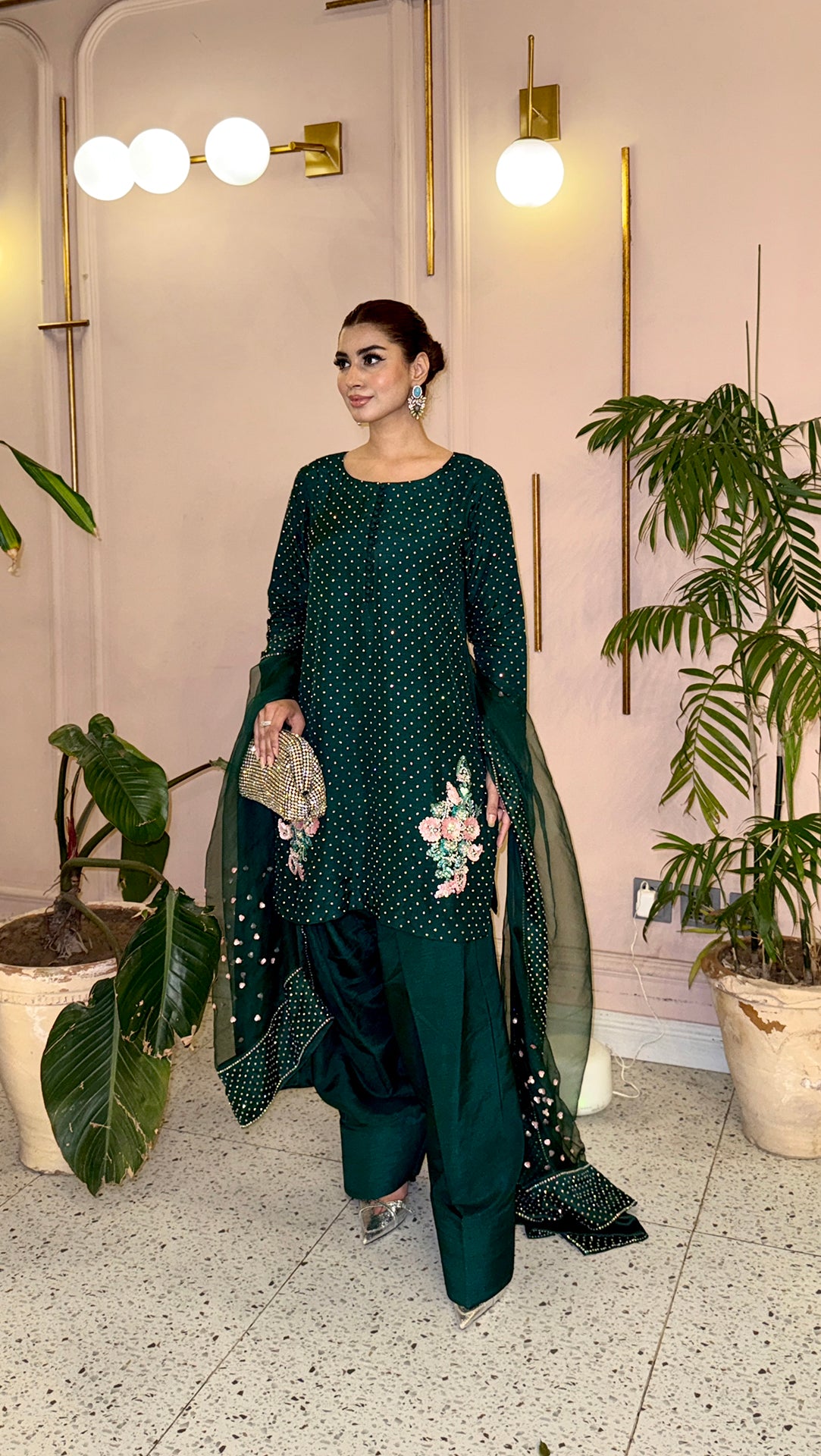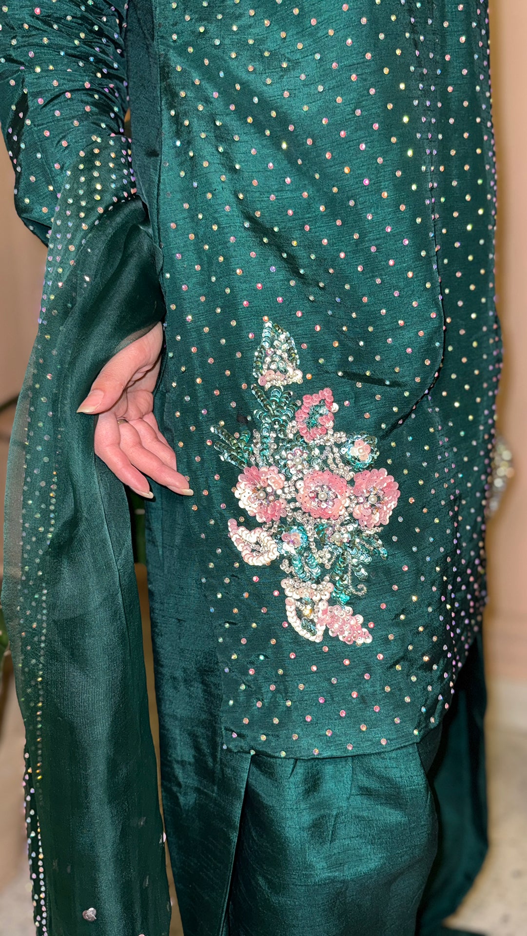 The shirt is adorned with beautiful multi light coloured with exquisite hand embriodery featuring a stunning mix of green and pink sequinswork that heighlights the richness of design.The luxurious korean raw silk fabric paired with traditional ������������������farshi shalwar and delicate organza dupata featuring a rhinestone embelishment border and spray ������������������this ensemble is perfect for festive occasions..the perfect ensemble for those who appricate the artistry of fine craftsmainship and luxury of timeless design