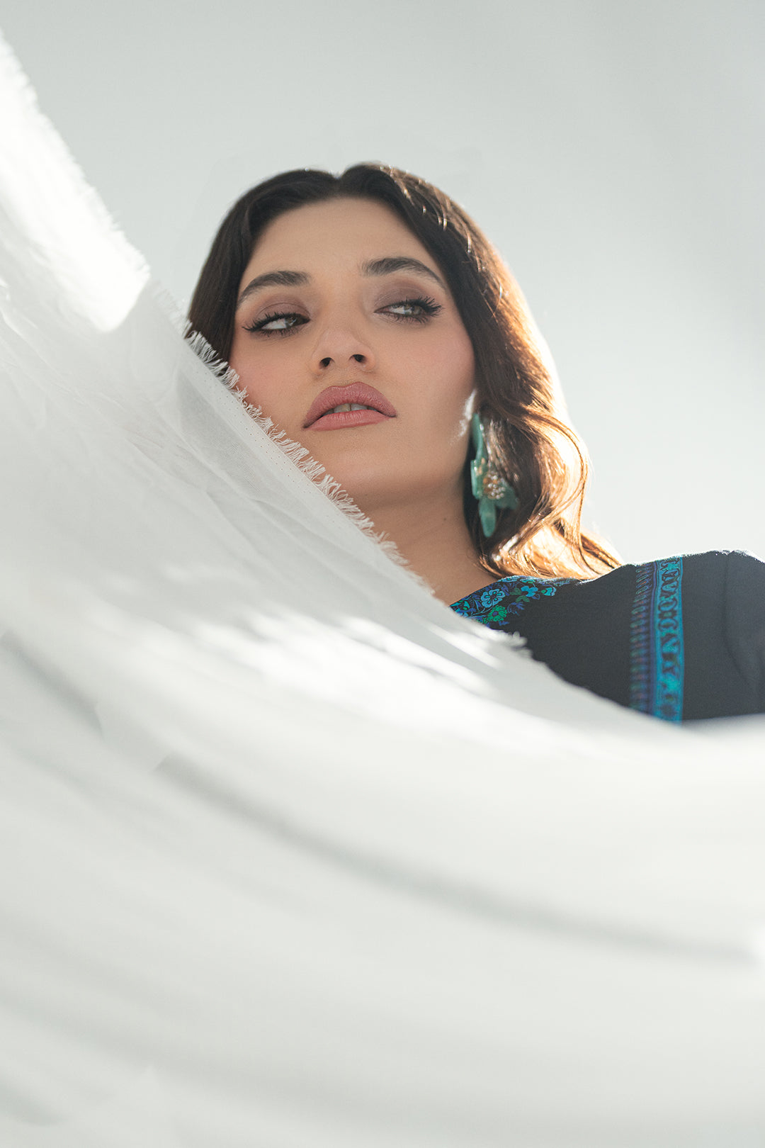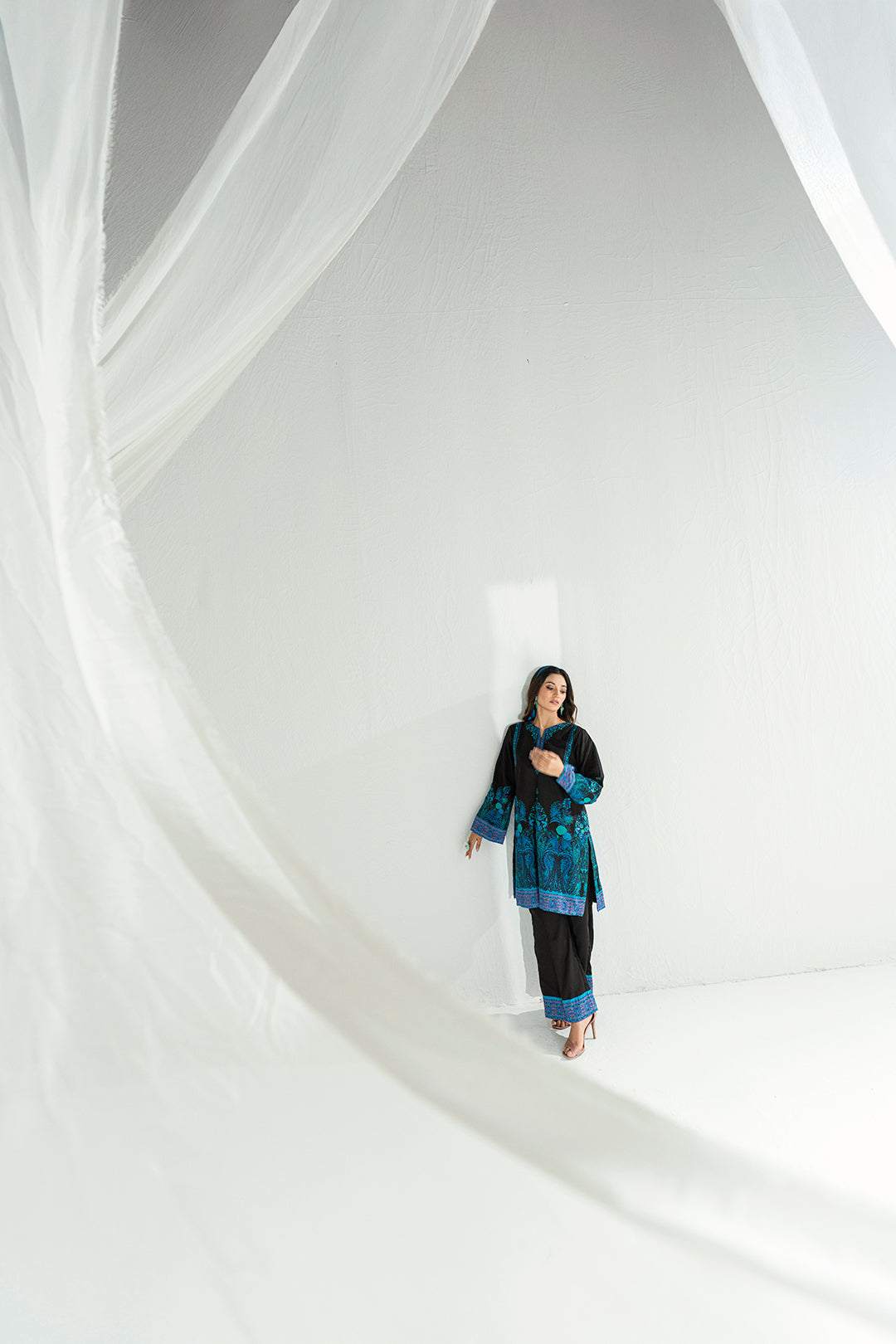 Make a bold impression with this striking ensemble in jet black, beautifully embellished with vibrant turquoise and sapphire blue florals. The intricate botanical print blooms gracefully along the hem and sleeves, adding a touch of mystique and refined elegance to the entire look.