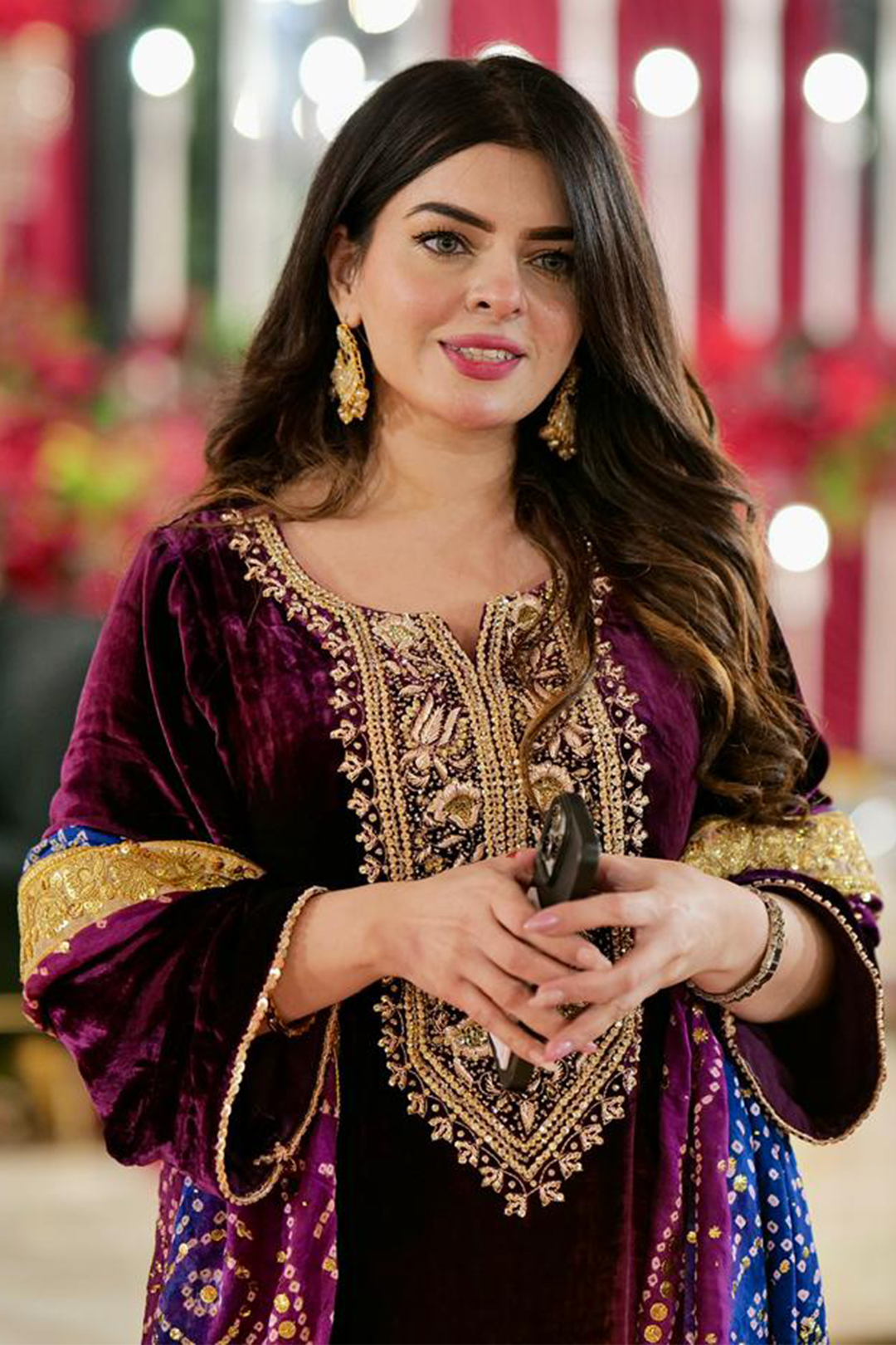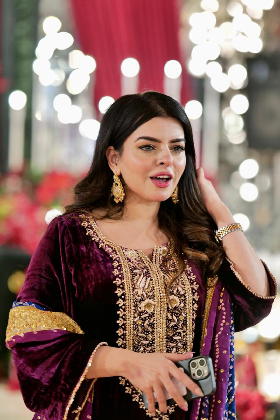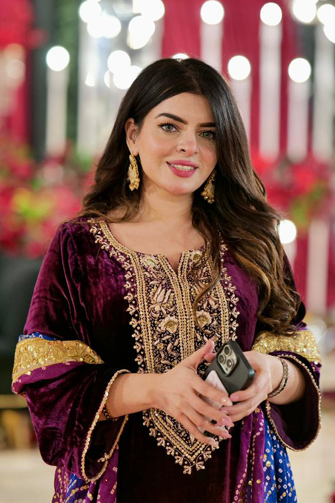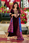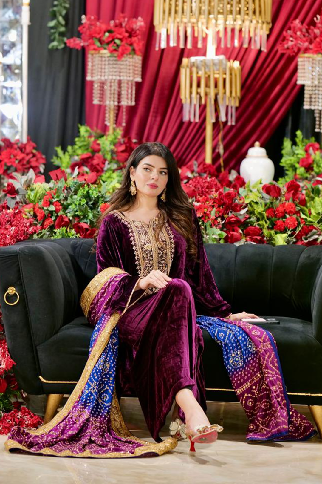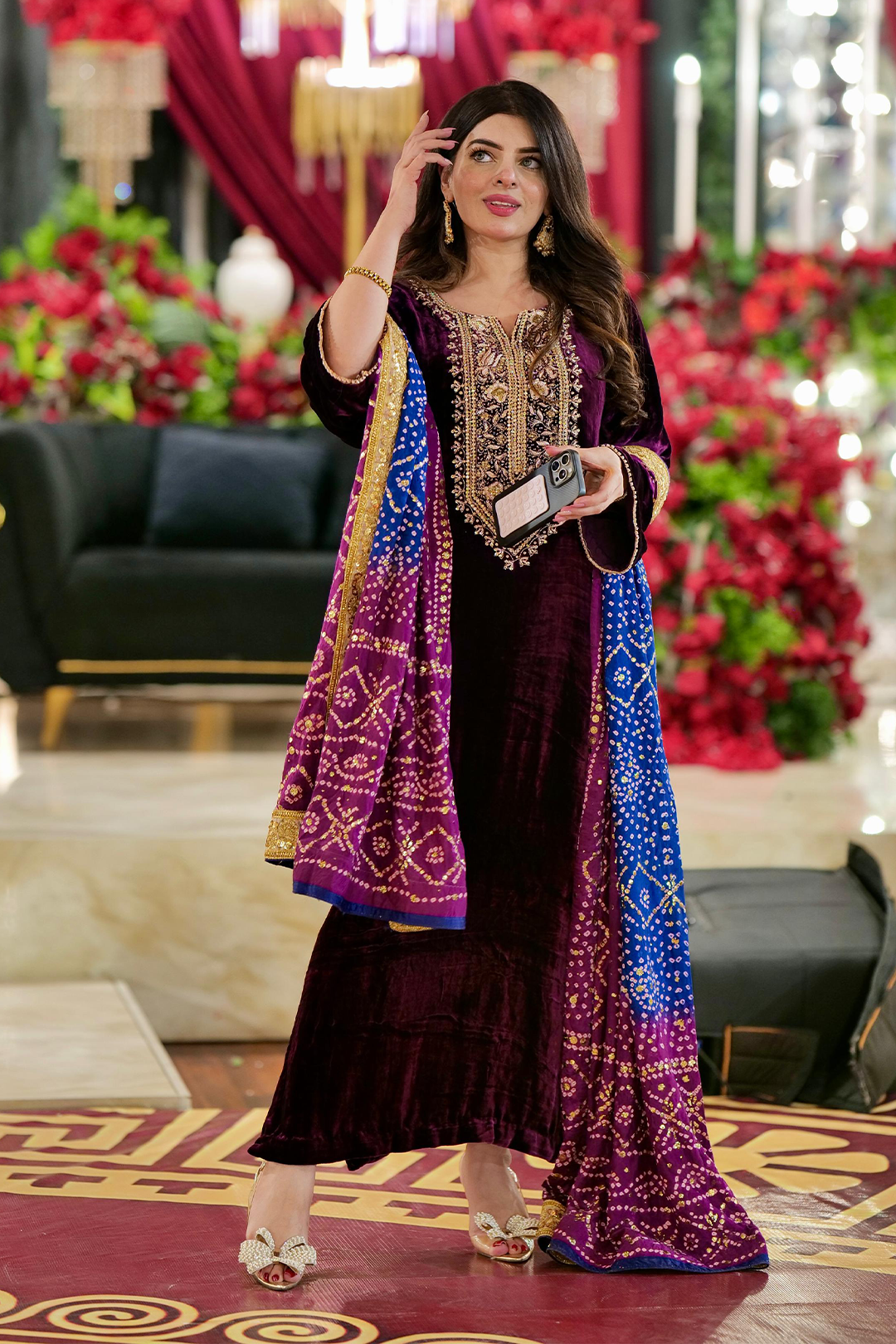 This ensemble is a luxurious deep plum velvet dress that exudes elegance and festive charm.The rich velvet fabric gives the outfit a royal and premium look,perfetct for formal events or wedding. Beautifully designed round neckline with intricate embellishment the entire neckline and front are adorned with heavy golden and bronze embriodery,including zari work,thread work and delicate bead detailing sleeves cuffs features a golden lace border with intricate design adding richness comes with matching trouser in same tone.The dupatta is the statment piece with a dual tone contrast design one side in royle blue the other is magenta/purple decoratef with block print style patterns,traditional motifs,and gold accents.Finished with fine gold edging ,harmonizing beautifully with the embriodery on the shirt.This ensemble is pe