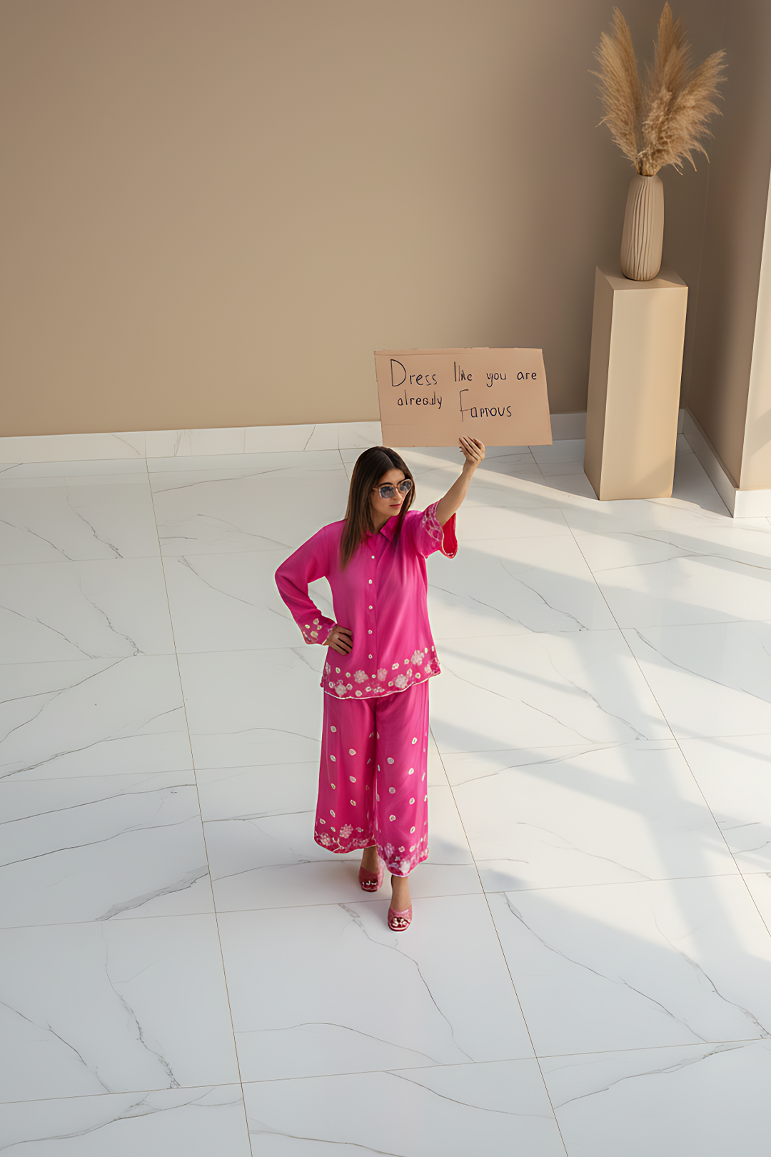 A vibrant fuchsia pink co-ord set crafted to make a blond and stylish statement.The outfit features delicate white embriodery that adds a soft contrast against the rich pink base creating n elegant and eye catching look.Made in premium smooth fabric.Designed in a comfortable straight cut silhouette for a sleek appearance.Adorned with intricate white embriodered motifs placed along the sleeves and hemline with matching embriodered trousers.perfect for casual chic outings and festive daywear