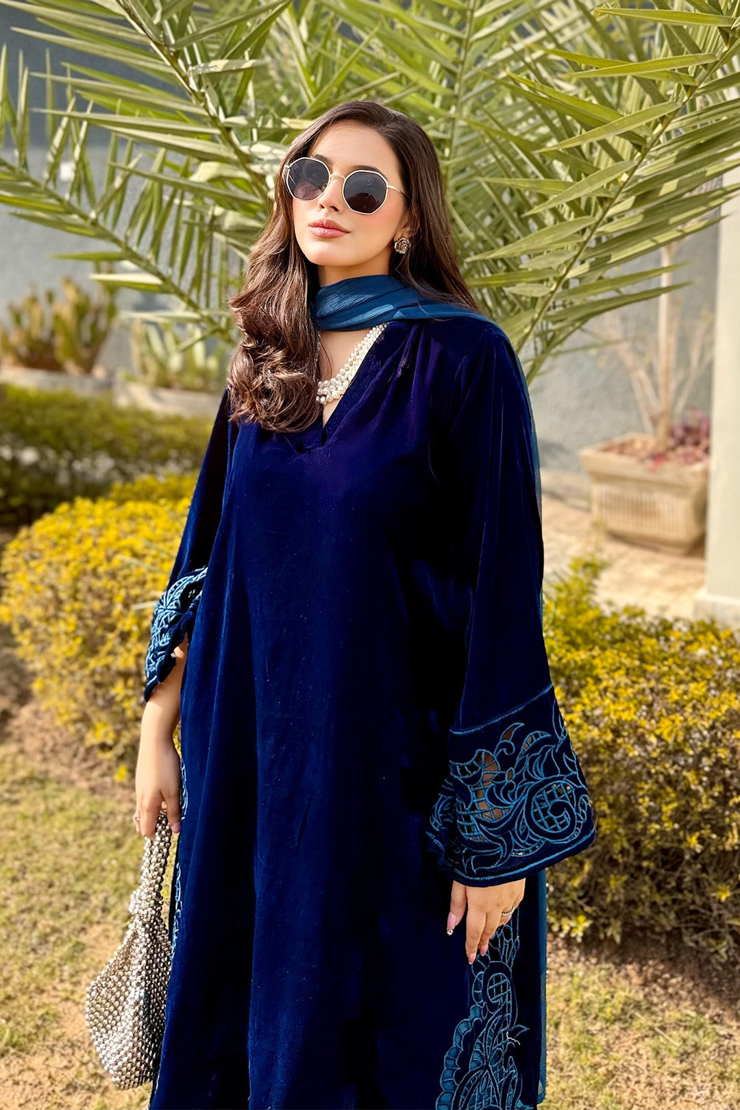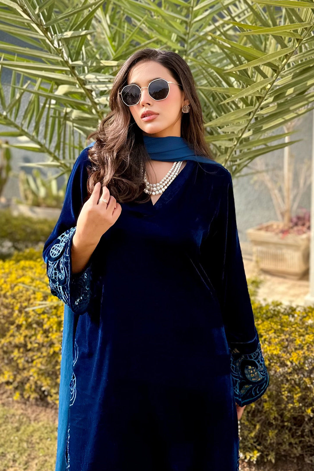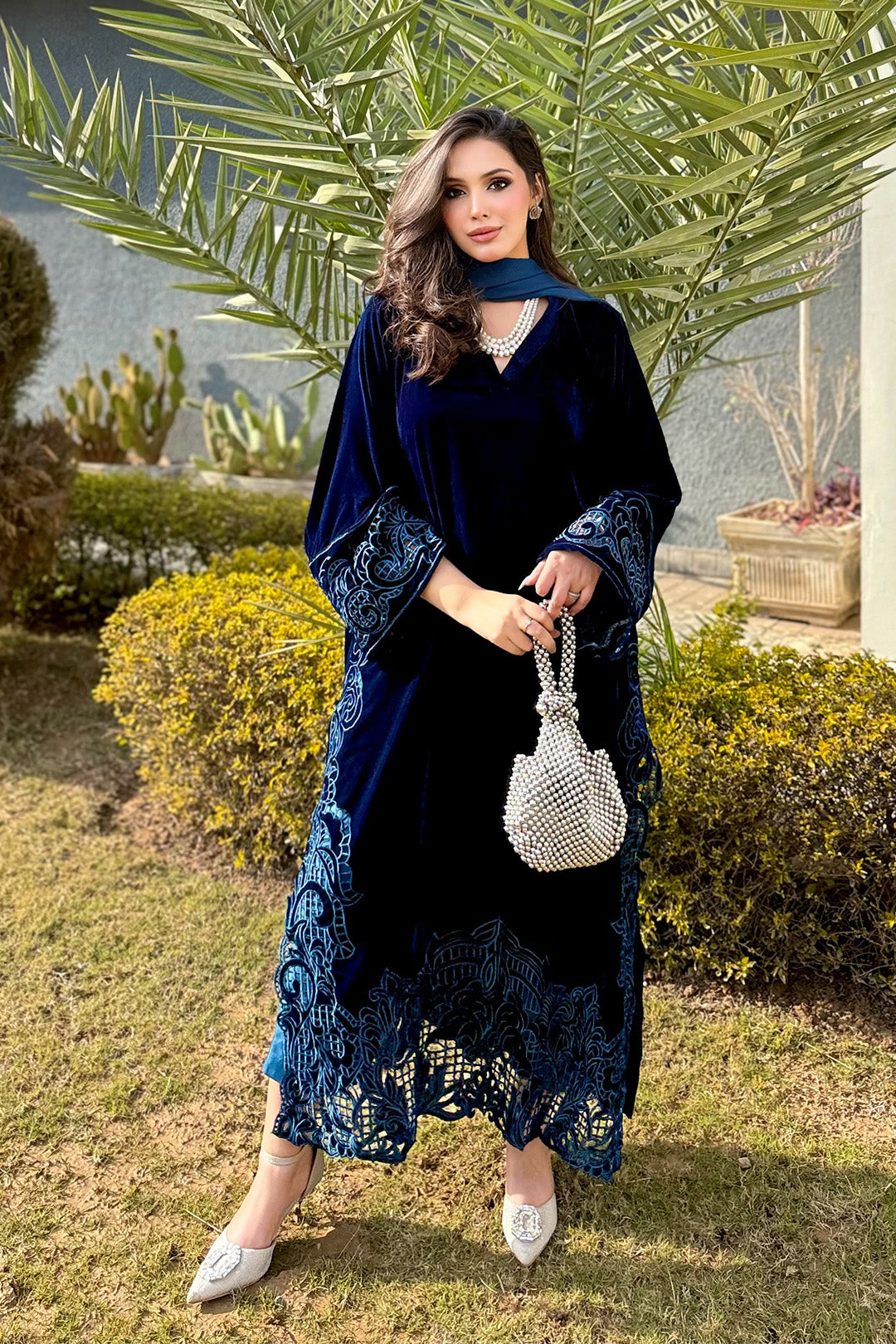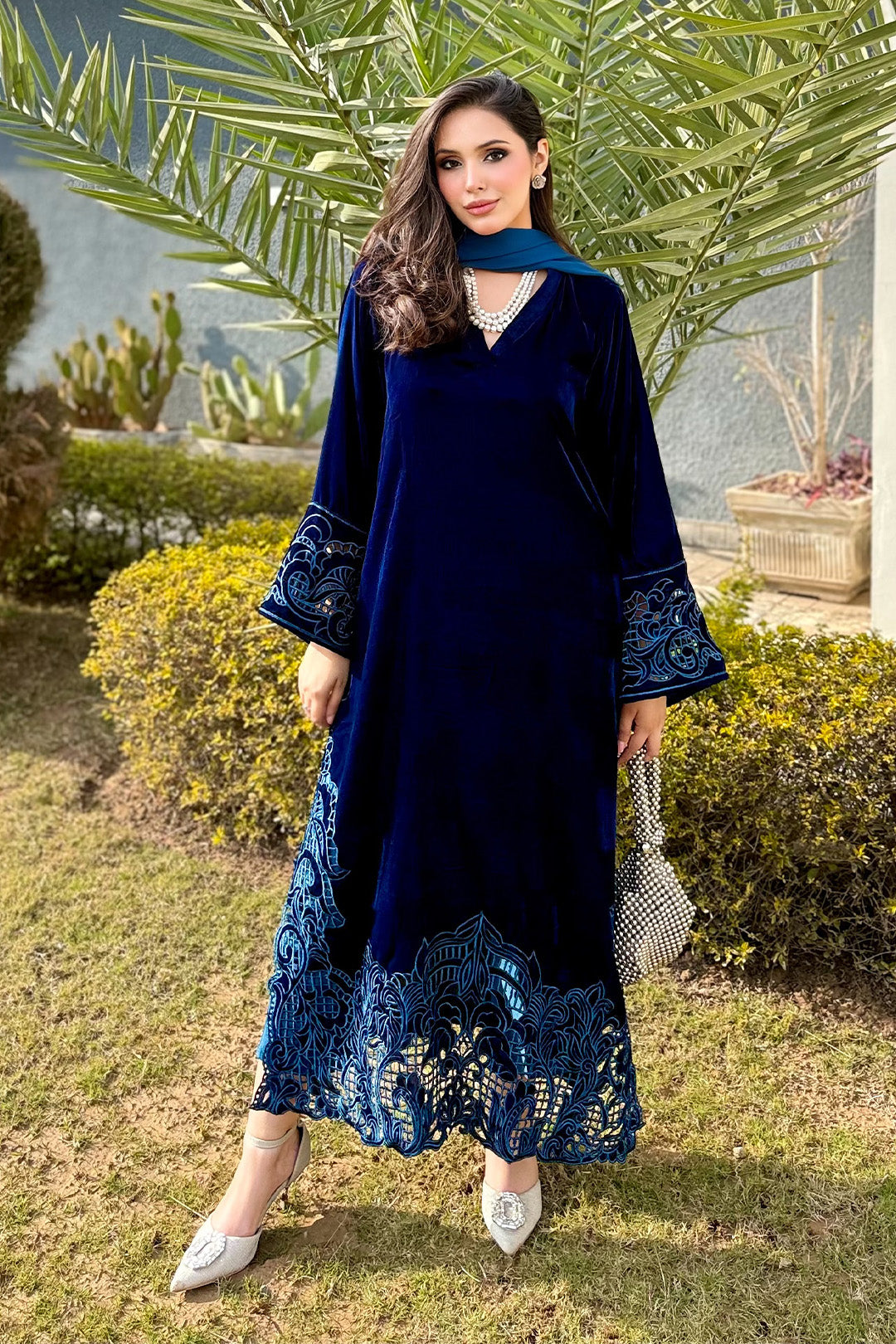 This ensemble is a deep zinc velvet kaftan style dress that exudes elegance and luxury.The dress is crafted from rich plush velvet fabric that naturally reflect light,giving it a soft regal sheen it features long side sleeves beautifully embellished with intricate maroon thread embriodery.The embriodery extends from the sleeves down toward the sides of the dress,adding a traditional yet refined touch.This ensemble is perfect for formal wear or evening wear
