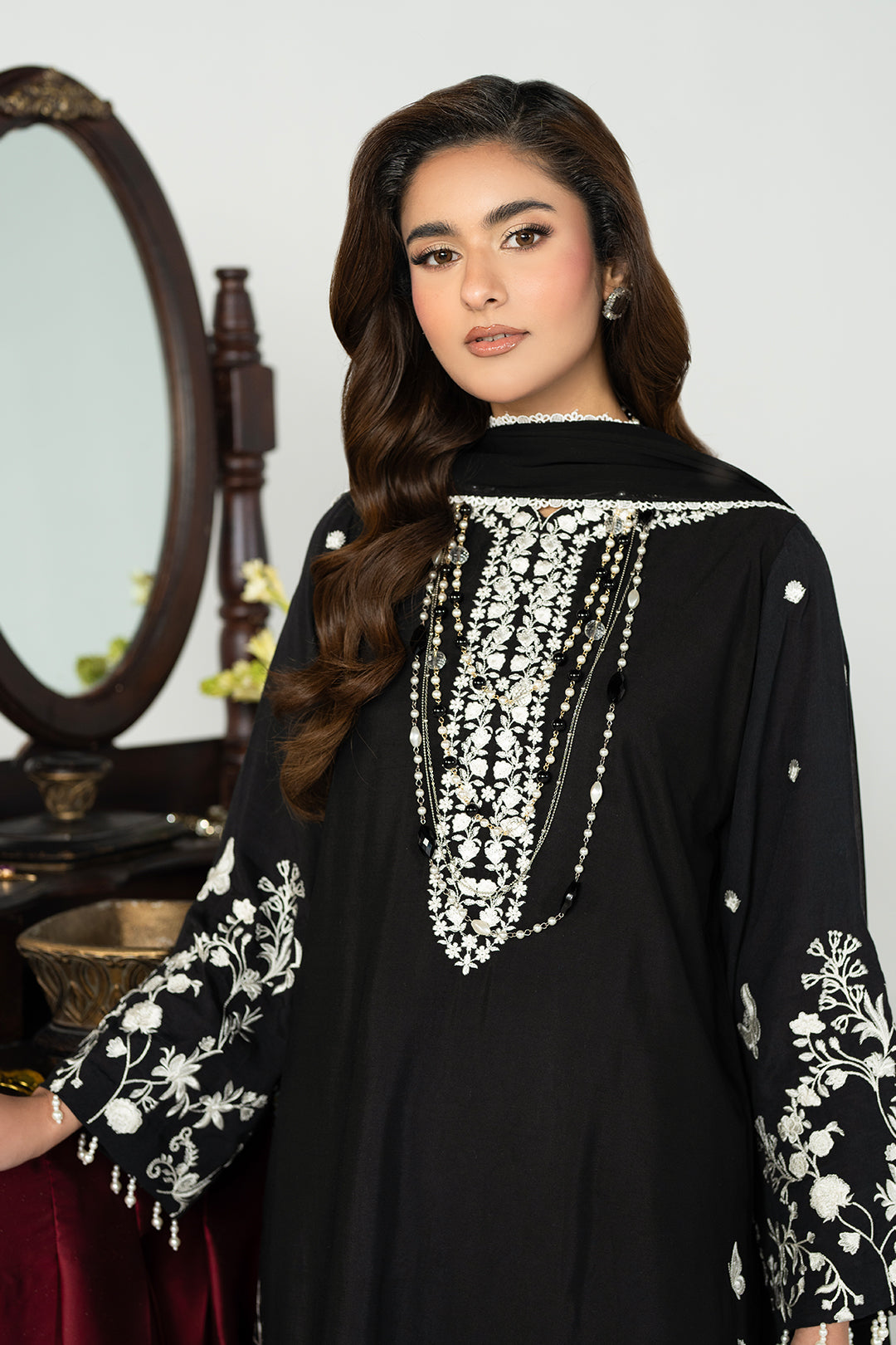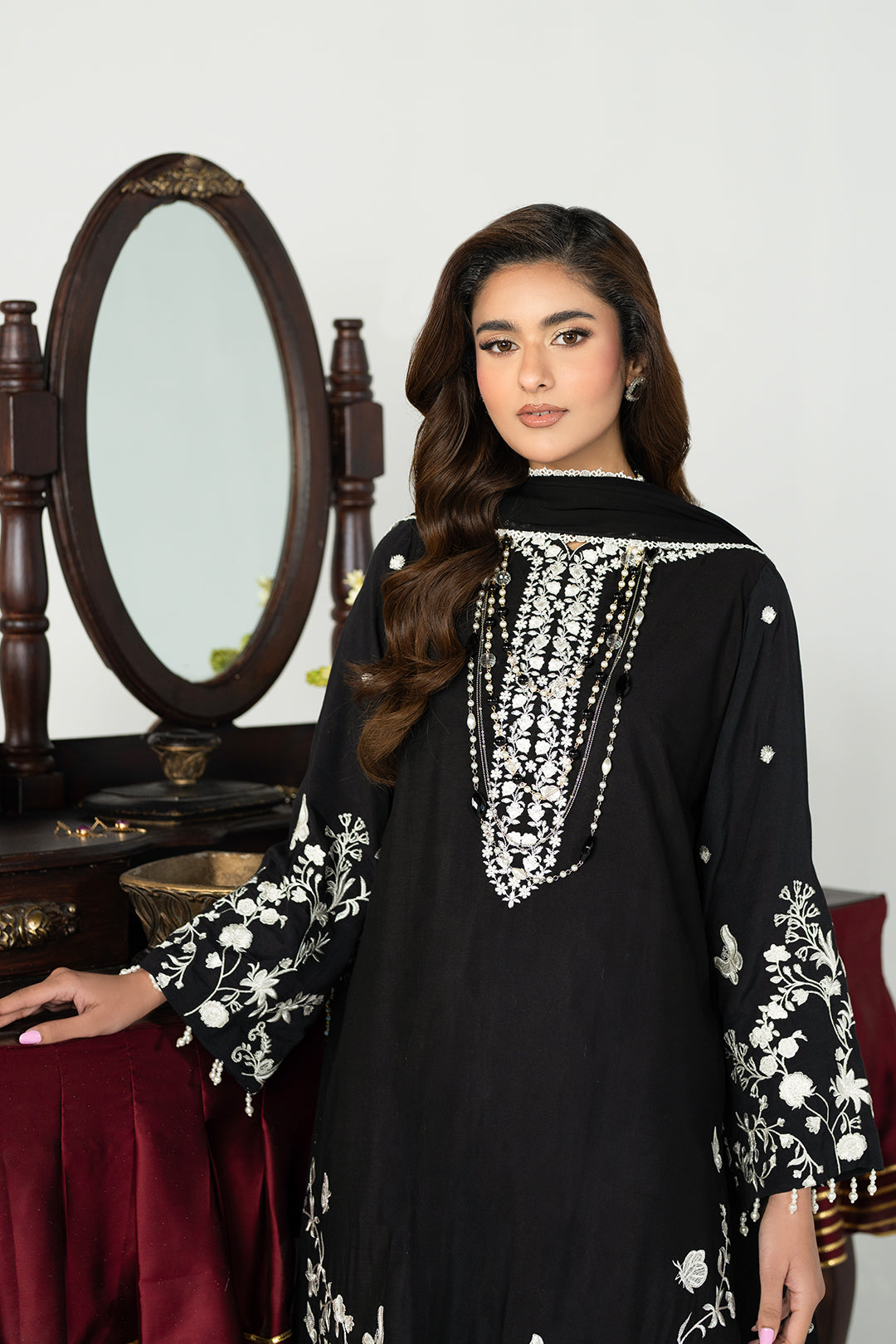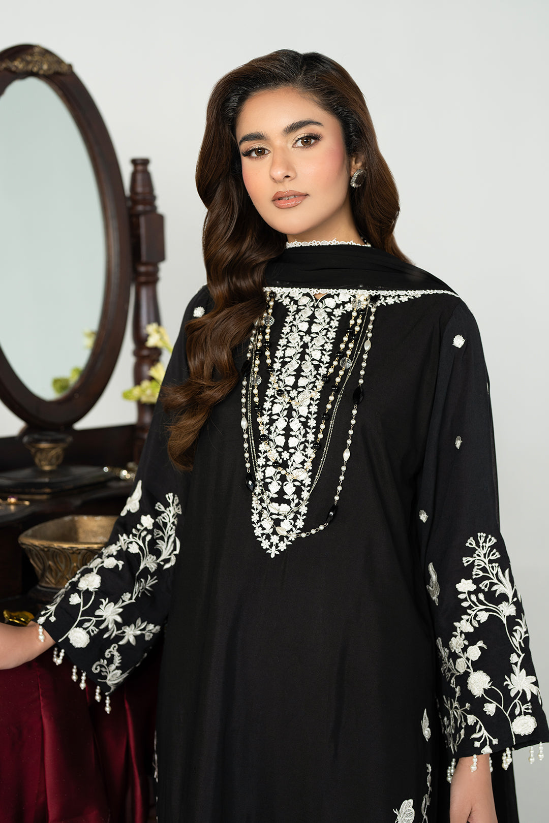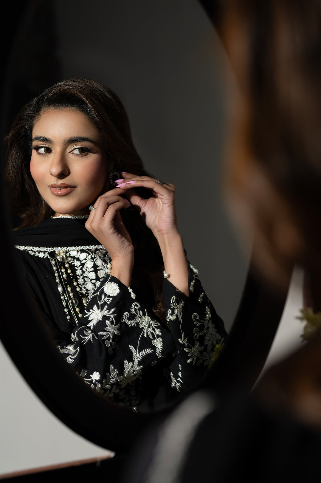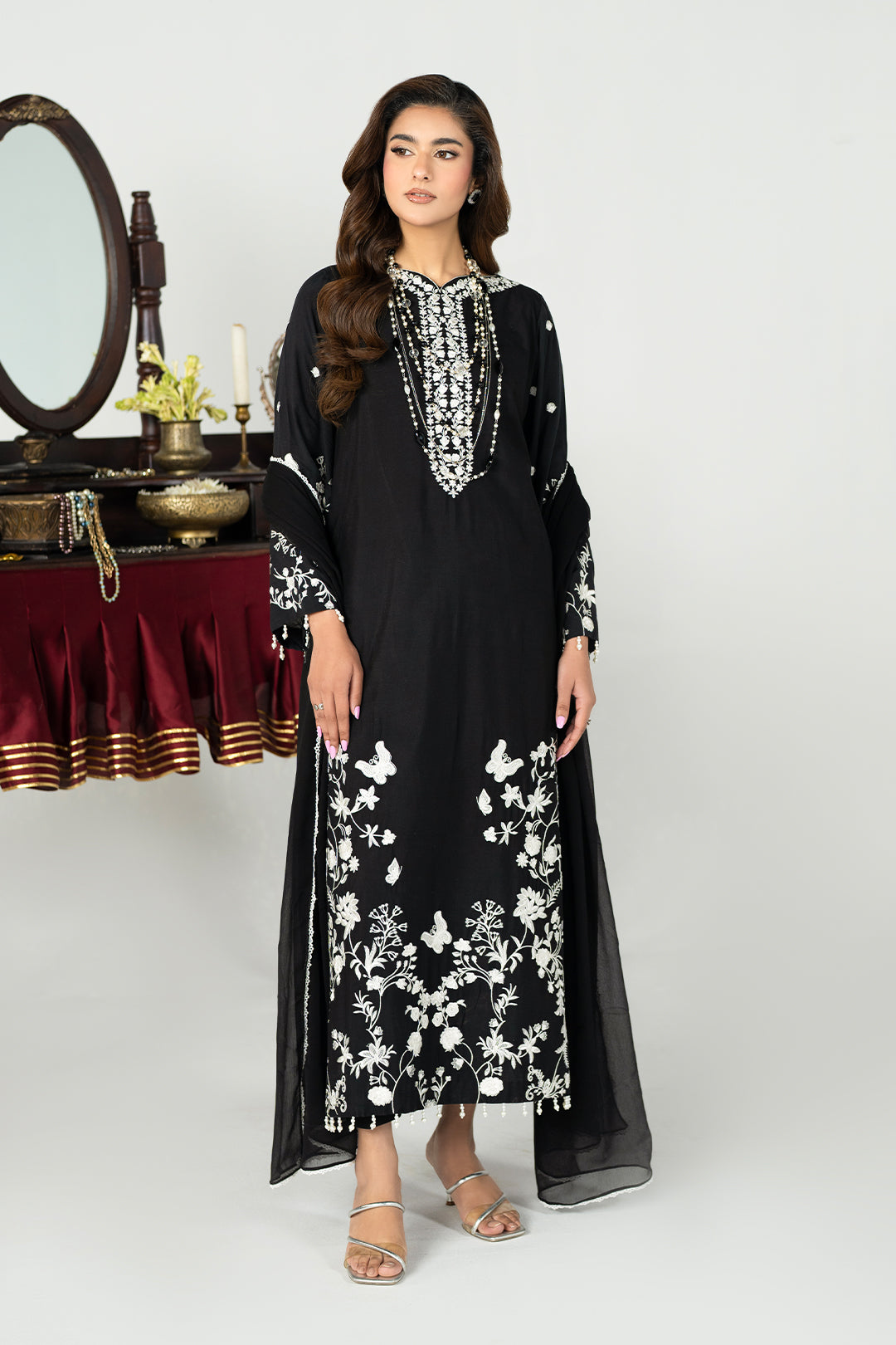 A classic black long shirt designed in a straight flowing silhouette beautifully enhanced with intricate white embroidery.The neckline is richly embellished with detailed embroidery creating a striking contrast against the black base and adding a refined focal point.The full length sleeves are delicately decorated with subtle embroidered accents and finished with fine detailing at the cuffs.The hem of the shirt features elaborate floral embroidery in white arranged gracefully to create a balanced and artistic finish.Paired with coordinating trouser and Dupatta the ensemble delivers a polished and graceful look.