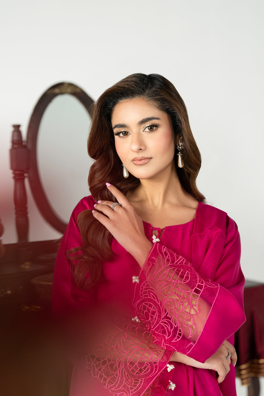 A striking fuchsia pink long shirt designed in a clean straight cut silhouette that falls gracefully.The neckline is kept minimal and accented with delicate tassels running vertically down.The full length sleeves are finished with intricate cutwork detailing at the cuffs lending a refined and feminine touch.The hemline is beautifully highlighted with detailed cutwork embroidery creating an elegant finish that enhances the overall design Paired with matching trouser and dupatta this ensemble offers a perfect balance of bold color and graceful detailing.This ensemble is perfect for festive gathering,evening wear or semi formal occasions.