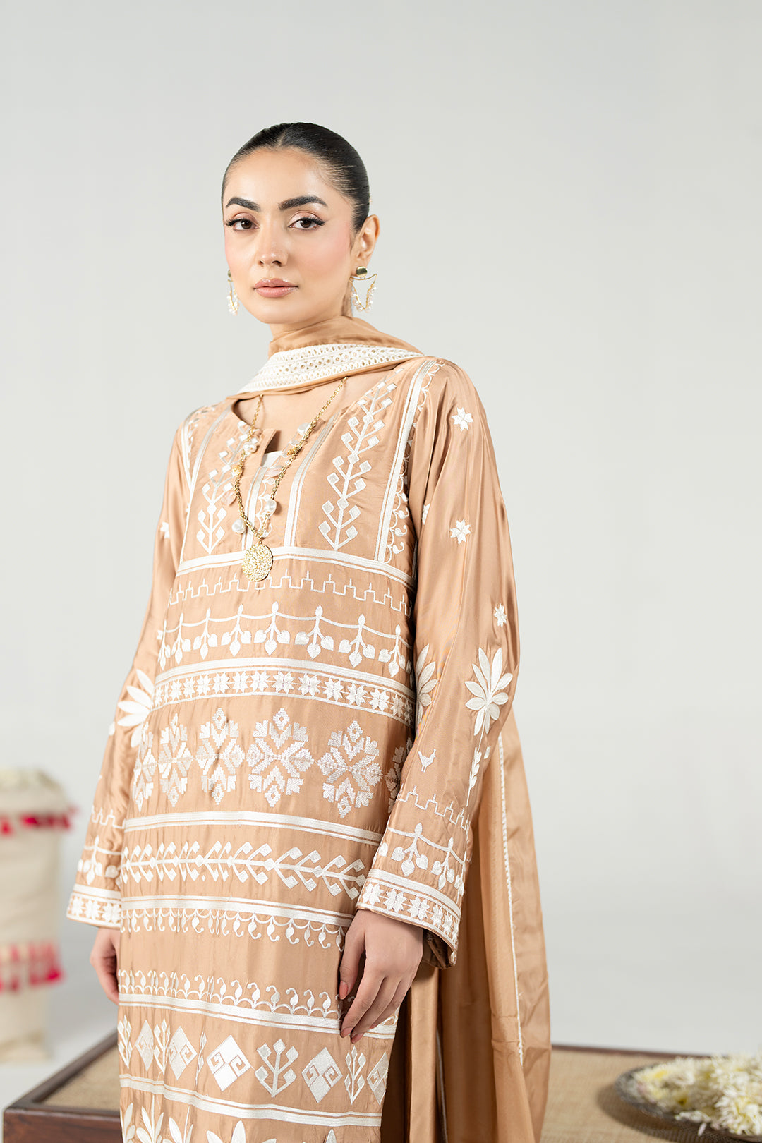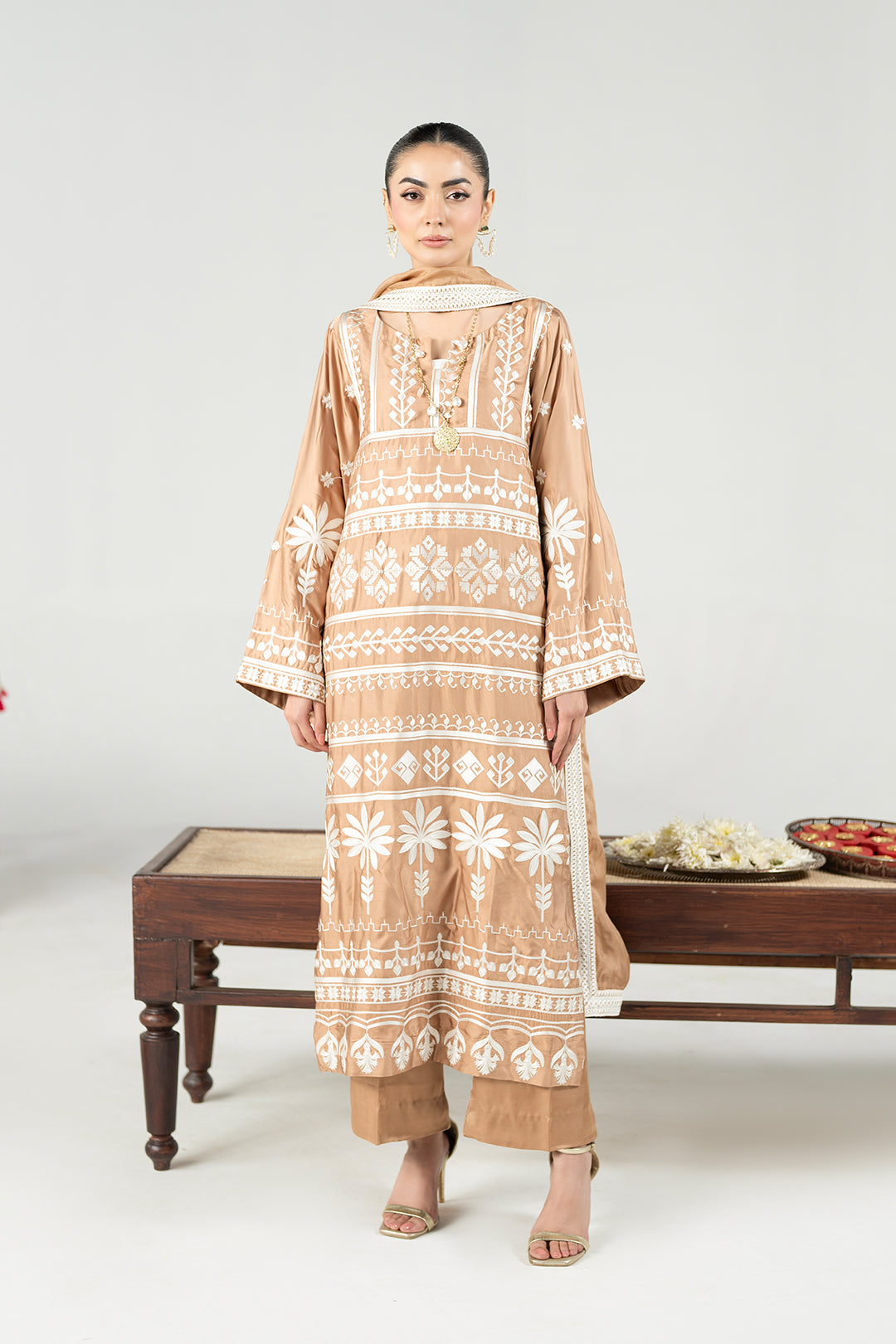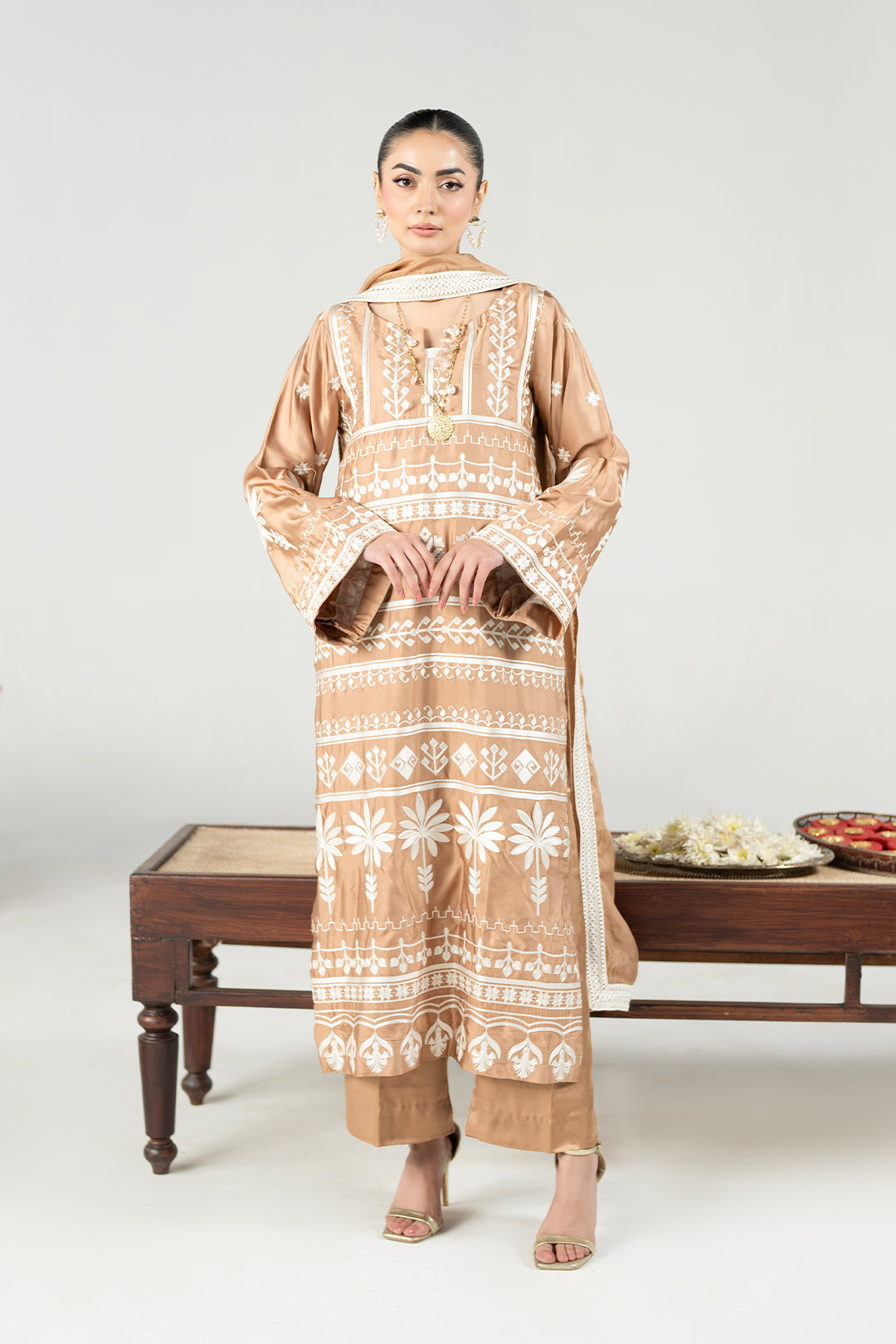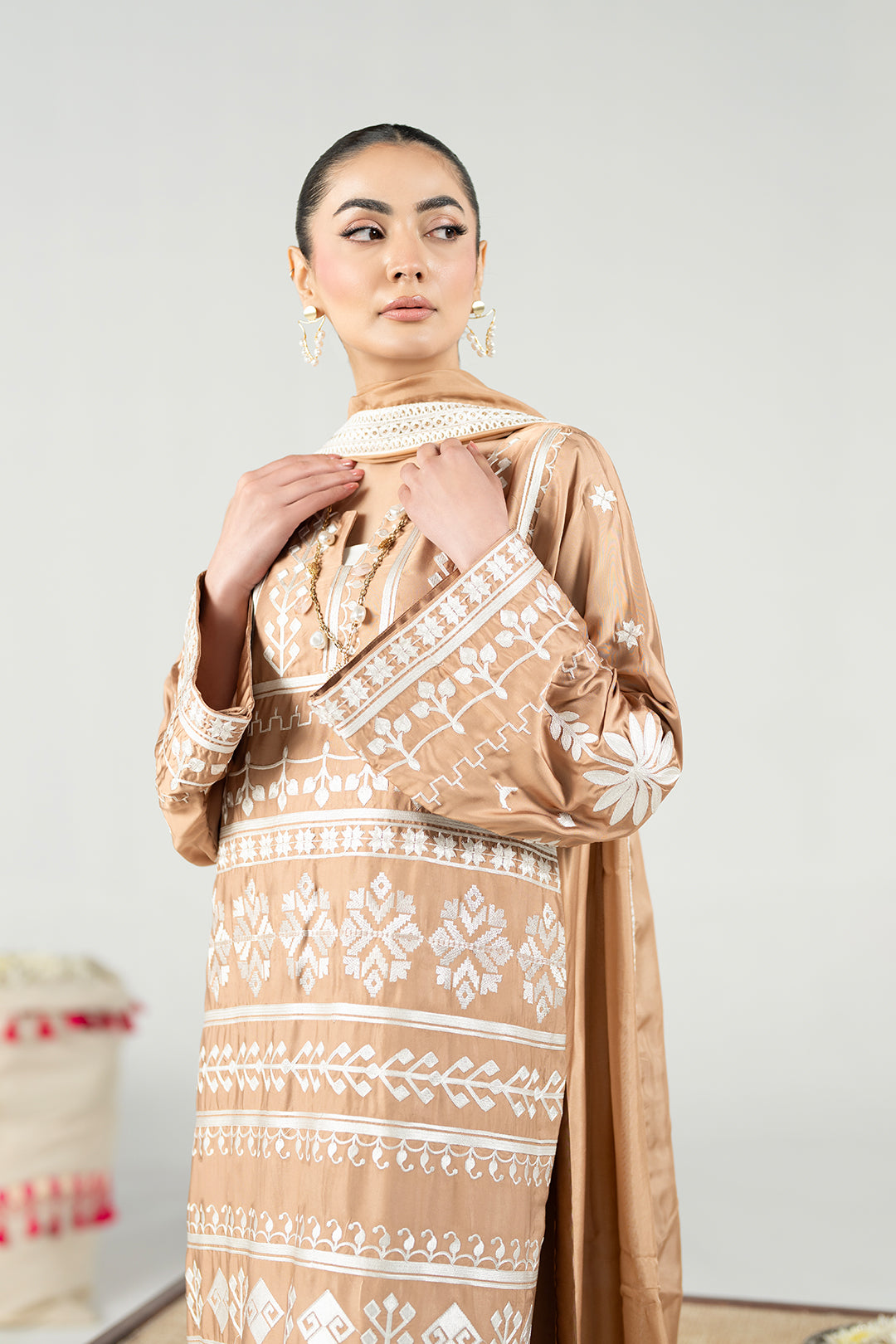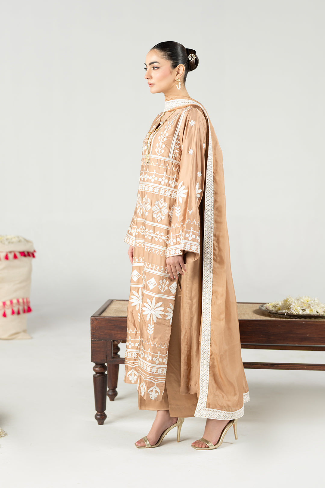 A graceful caramel brown ensemble crafted from a soft flowy fabric beautifully adorned with white embroidered motifs throughout.The shirt is a relaxed straight silhouette with intricate geometric and floral embroidery arranged in horizontal panels giving it a traditional yet refined appeal.The neckline is modestly slit and highlighted with delicate embroidered borders adding subtle elegance.The full length sleeves are detailed with matching white embroidery finished with patterned cuffs and enhance the overall cohesiveness of the design.Paired with a matching plain dupatta and trouser.This outfit is perfect for daytime events or festive occasions.