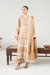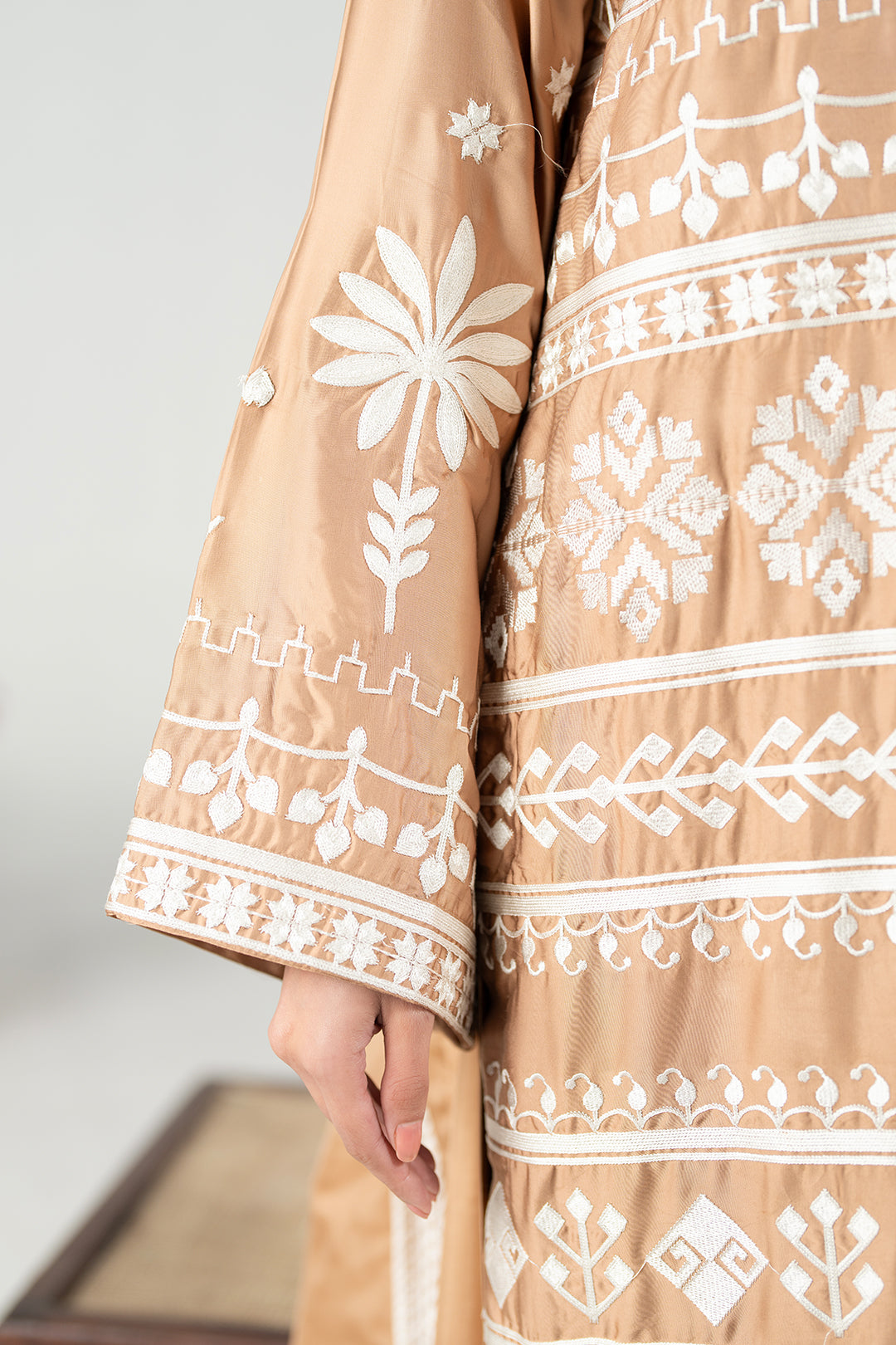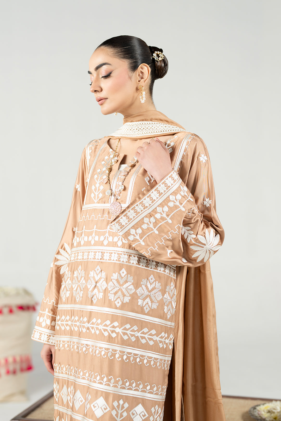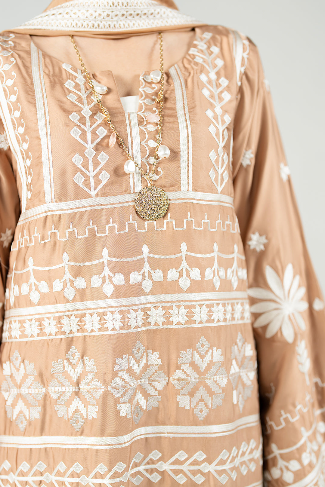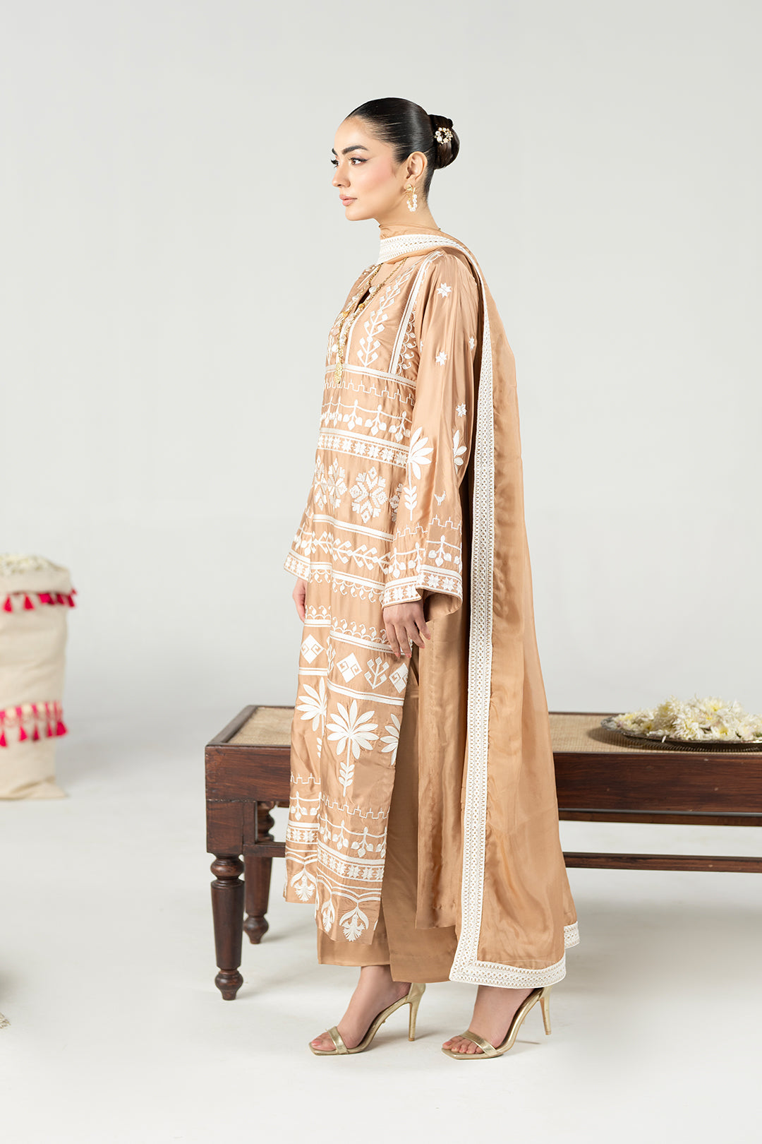 A graceful caramel brown ensemble crafted from a soft flowy fabric beautifully adorned with white embroidered motifs throughout.The shirt is a relaxed straight silhouette with intricate geometric and floral embroidery arranged in horizontal panels giving it a traditional yet refined appeal.The neckline is modestly slit and highlighted with delicate embroidered borders adding subtle elegance.The full length sleeves are detailed with matching white embroidery finished with patterned cuffs and enhance the overall cohesiveness of the design.Paired with a matching plain dupatta and trouser.This outfit is perfect for daytime events or festive occasions.