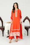 A vibrant fiery orange three piece ensemble that exudes festive elegance and timeless charm.The straight cut shirt is crafted from smooth flowy fabric and adorned with intricate white embroidery along the neckline front panel sleeves cuffs and hemline.The embroidery features traditional floral motifs creating a striking contrast against the bold orange base.The round neckline with a center slit is richly detailed drawing attention to the finely worked front panel.The full length sleeves are enhanced with matching embroidered borders.The shirt is paired with matching straight trouser ensuring a clean and polished silhouette.Completing the look is a sheer matching dupatta delicately finished with lace edging adding softness and graceful movement to the ensemble.This outfit is perfect for gathering or festive occasion