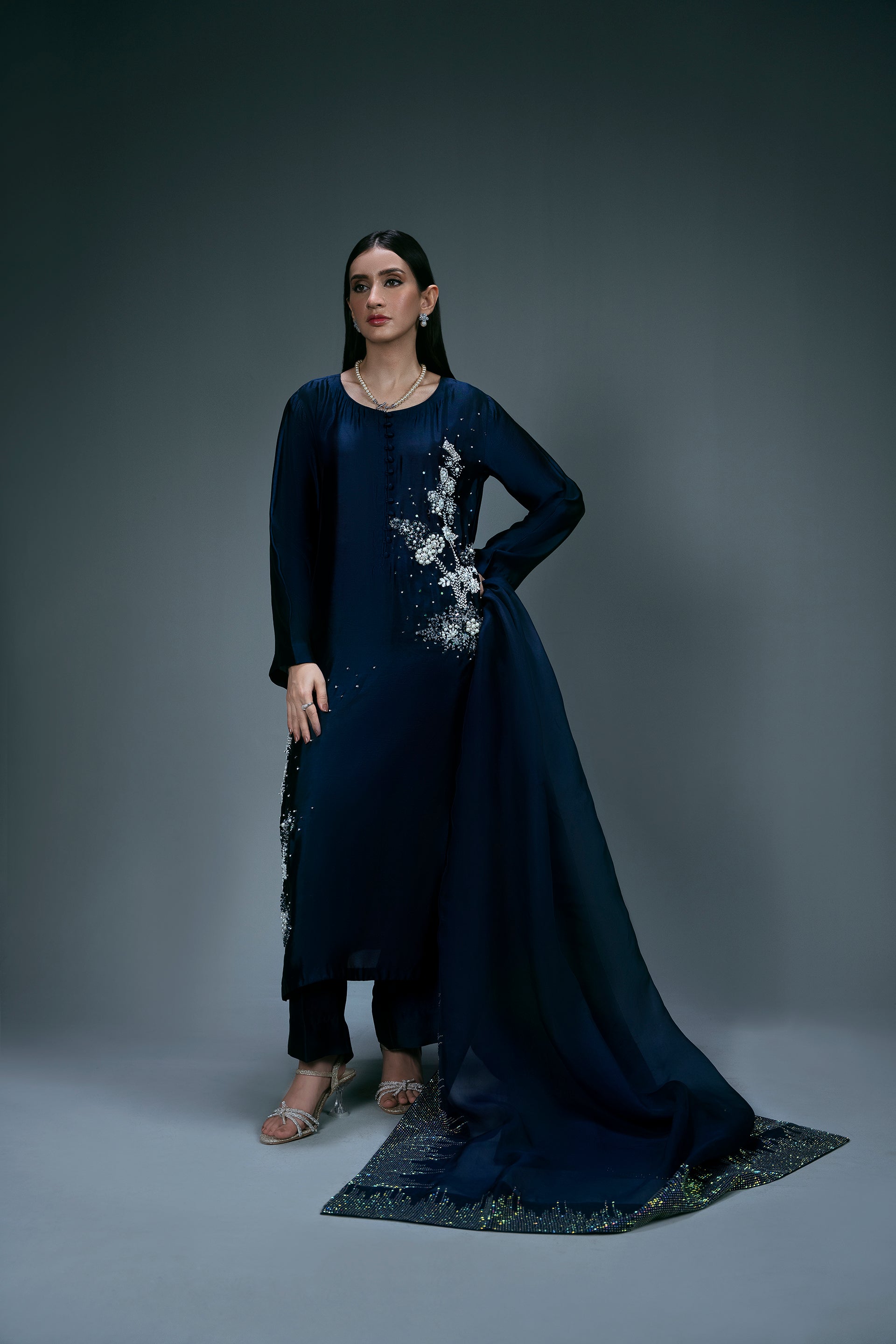 A three-piece suit in dark blue featuring a sleek cut. The shirt is crafted from pure tassel silk with hand embroidery adorned with pearls, crystals, and sequins. It comes with matching straight-cut trousers and a pure organza dupatta, embellished with rhinestones.